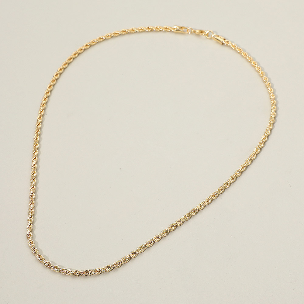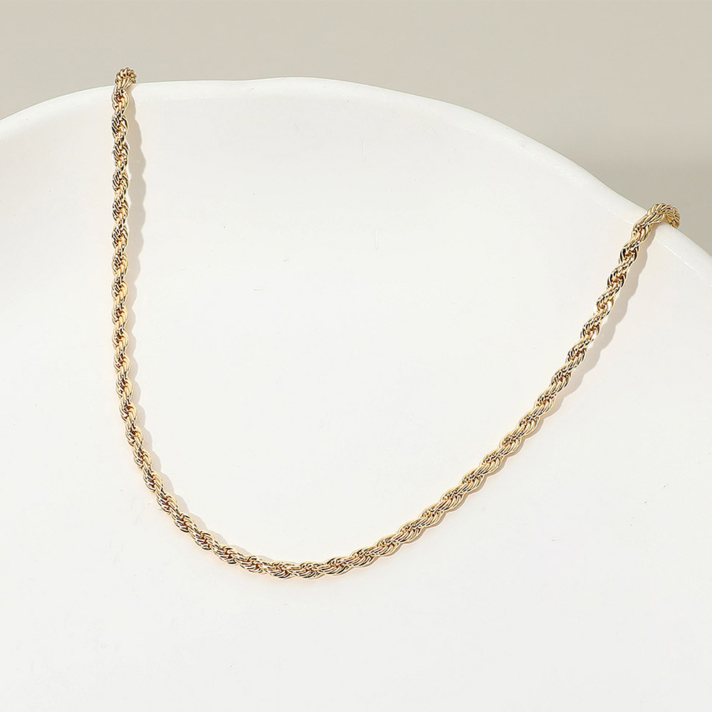 Details • Necklace Size : 18" L • Decor Size : 0.1" L (3mm) • Classic twisted rope chain necklace featuring delicate braided links that catch the light beautifully. Its textured design adds depth and shine, making it a timeless accessory for elegant layering or a polished standalone look. • Lead and Nickel Compliant • Gold Filled • Made In Brazil