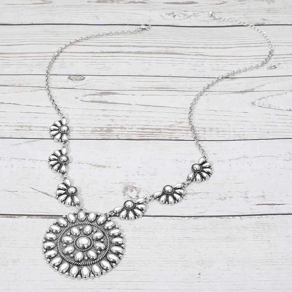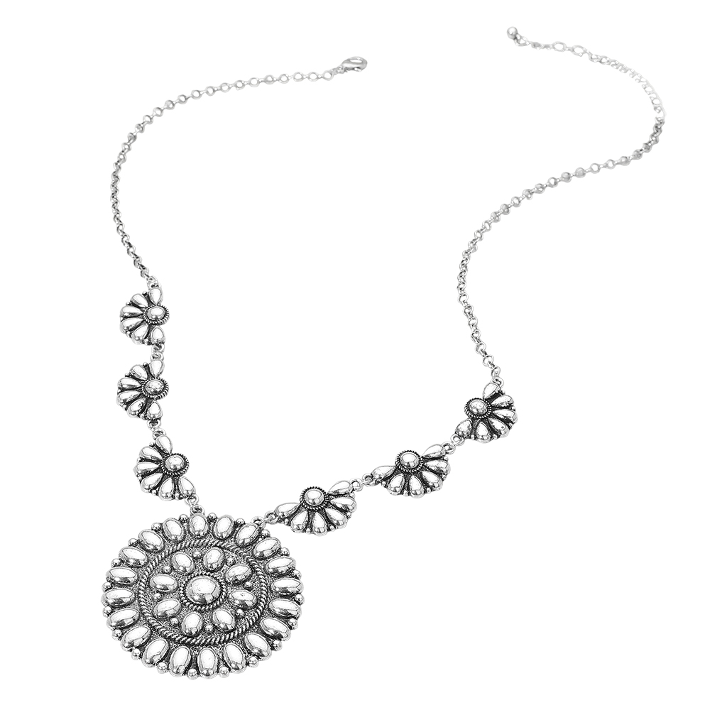Details • Necklace Size : 22" + 3" L • Decor Size : 0.6" L • Pendant Size : 2.1" X 2.1" • Statement necklace designed with linked floral accents and a bold round medallion centerpiece that adds depth and visual balance. A standout accessory for western, boho, festival, or boutique collections, offering eye-catching detail and versatile styling for everyday wear or special occasions. • Lead and Nickel Compliant