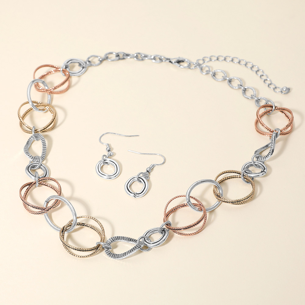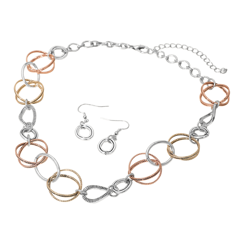 • This modern necklace and earring set showcases interlocking rings in varied shapes and textured finishes, creating a stylish, sculptural look. Designed to complement both casual and elevated outfits, it adds artistic detail and versatile elegance to any jewelry collection.