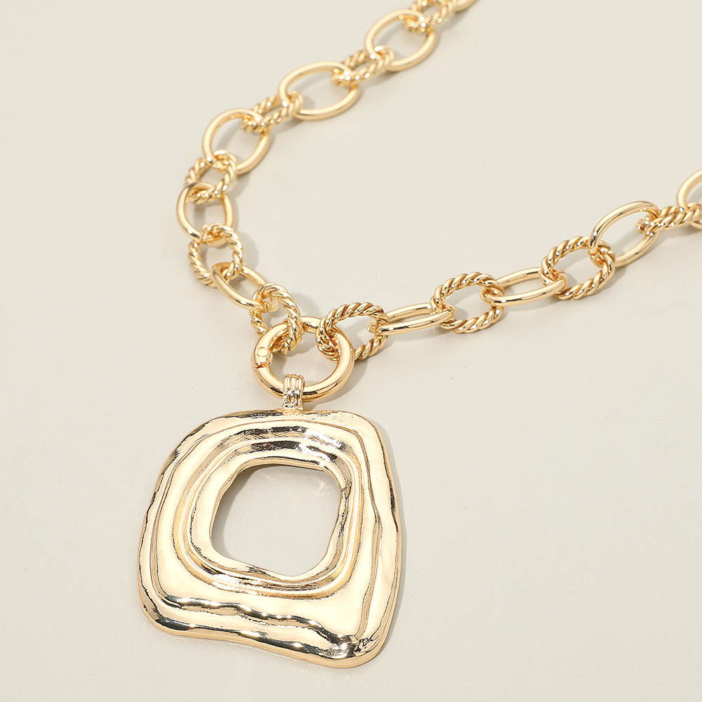 Details • Necklace Size : 18.5" + 0.5" L • Pendant Size : 1.8" X 2.8" • Elevate your outfit with this modern abstract link necklace featuring a bold textured pendant and statement chain. Its contemporary design brings a touch of sophistication and artistic flair, making it a versatile piece perfect for both casual and dressy occasions. • Lead and Nickel Compliant