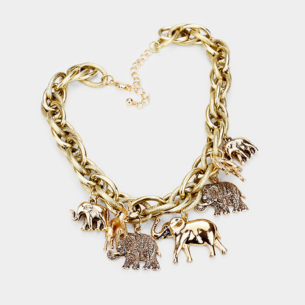 Details • Necklace Size : 18" + 3" L • Decor Size : 2" L • Earring Size: 1.5" L • Bold statement necklace featuring layered chain styling accented with detailed elephant charms and a coordinated drop earring pair. Designed to create visual impact, this playful yet elegant set adds character and charm to everyday outfits, themed looks, and special occasions with an eye-catching silhouette. • Lead and Nickel Compliant