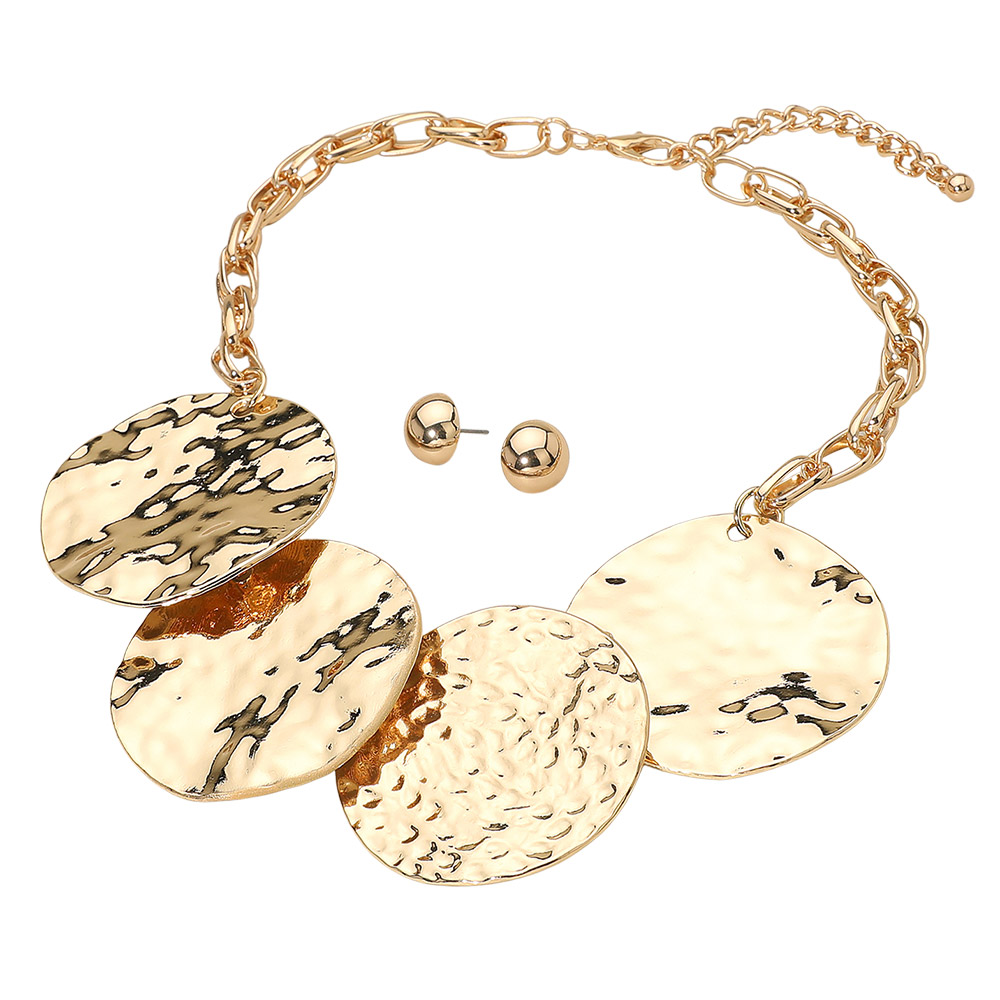 Details • Necklace Size : 18" + 3" L • Decor Size : 2.3" L • Earrings Size : 0.5" L • Stand out with this hammered disc necklace and matching stud earring set designed to deliver bold texture and modern shine. Featuring layered circular pendants and an adjustable chain, it’s ideal for elevating everyday outfits or enhancing evening looks with confident, contemporary style and coordinated elegance. • Lead and Nickel Compliant