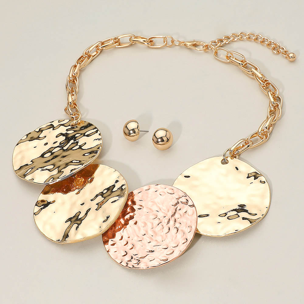 Details • Necklace Size : 18" + 3" L • Decor Size : 2.3" L • Earrings Size : 0.5" L • Stand out with this hammered disc necklace and matching stud earring set designed to deliver bold texture and modern shine. Featuring layered circular pendants and an adjustable chain, it’s ideal for elevating everyday outfits or enhancing evening looks with confident, contemporary style and coordinated elegance. • Lead and Nickel Compliant