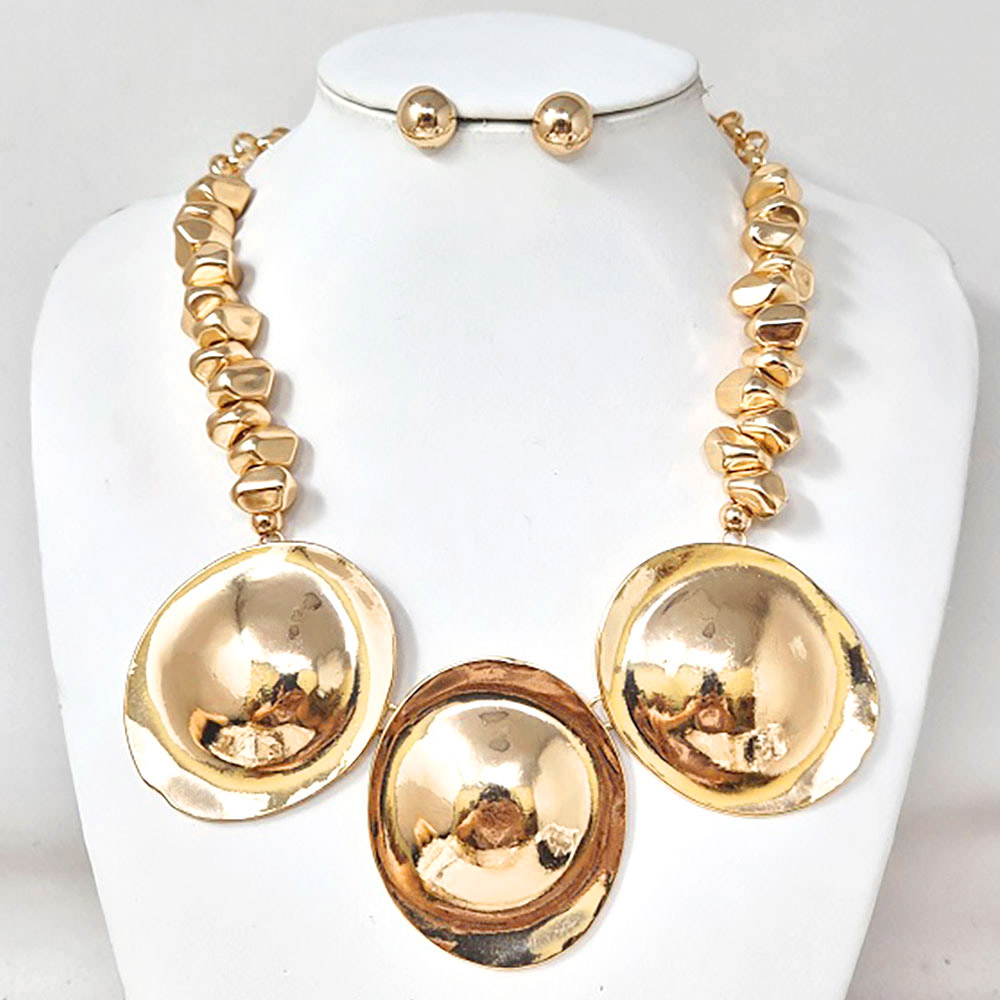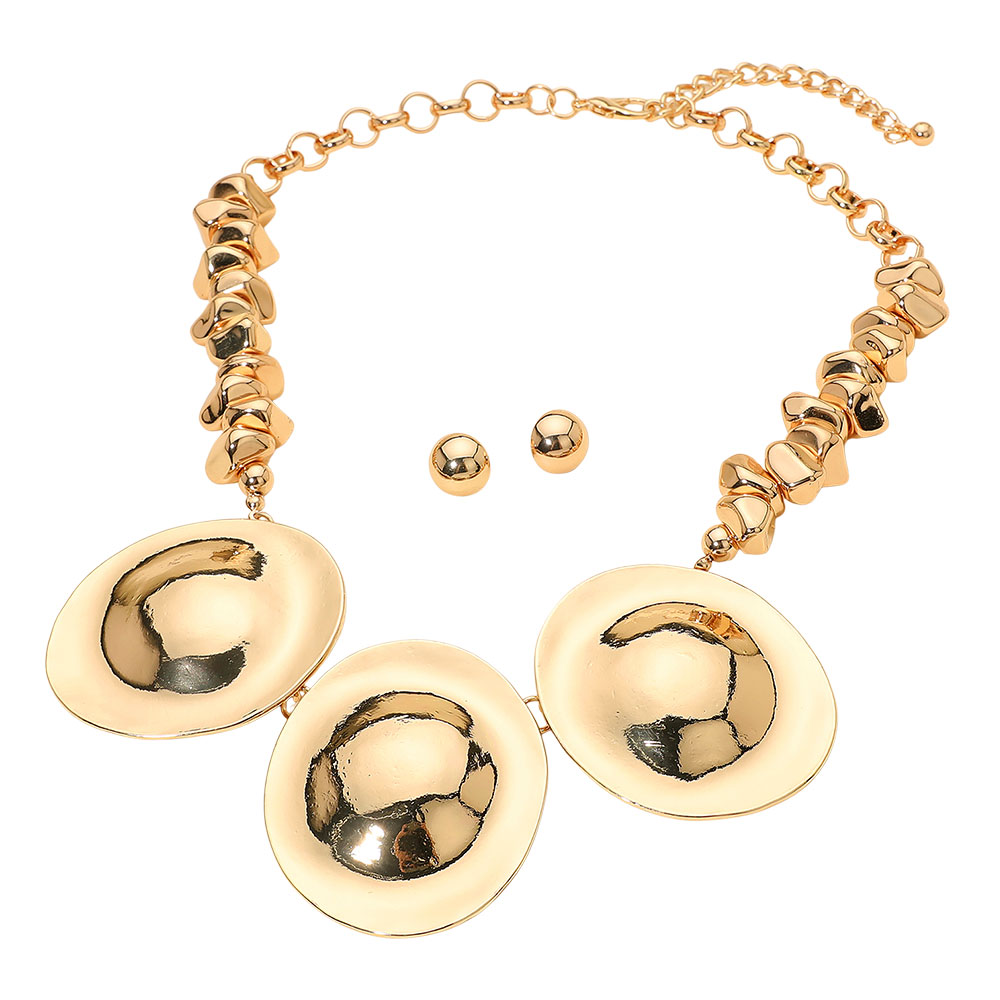 • Elevate your look with this striking necklace featuring sculpted disc accents paired with classic stud earrings. Designed for bold, artistic style, this set adds a dramatic touch to evening outfits, special events, or statement fashion moments, offering standout elegance with a modern, eye-catching finish.