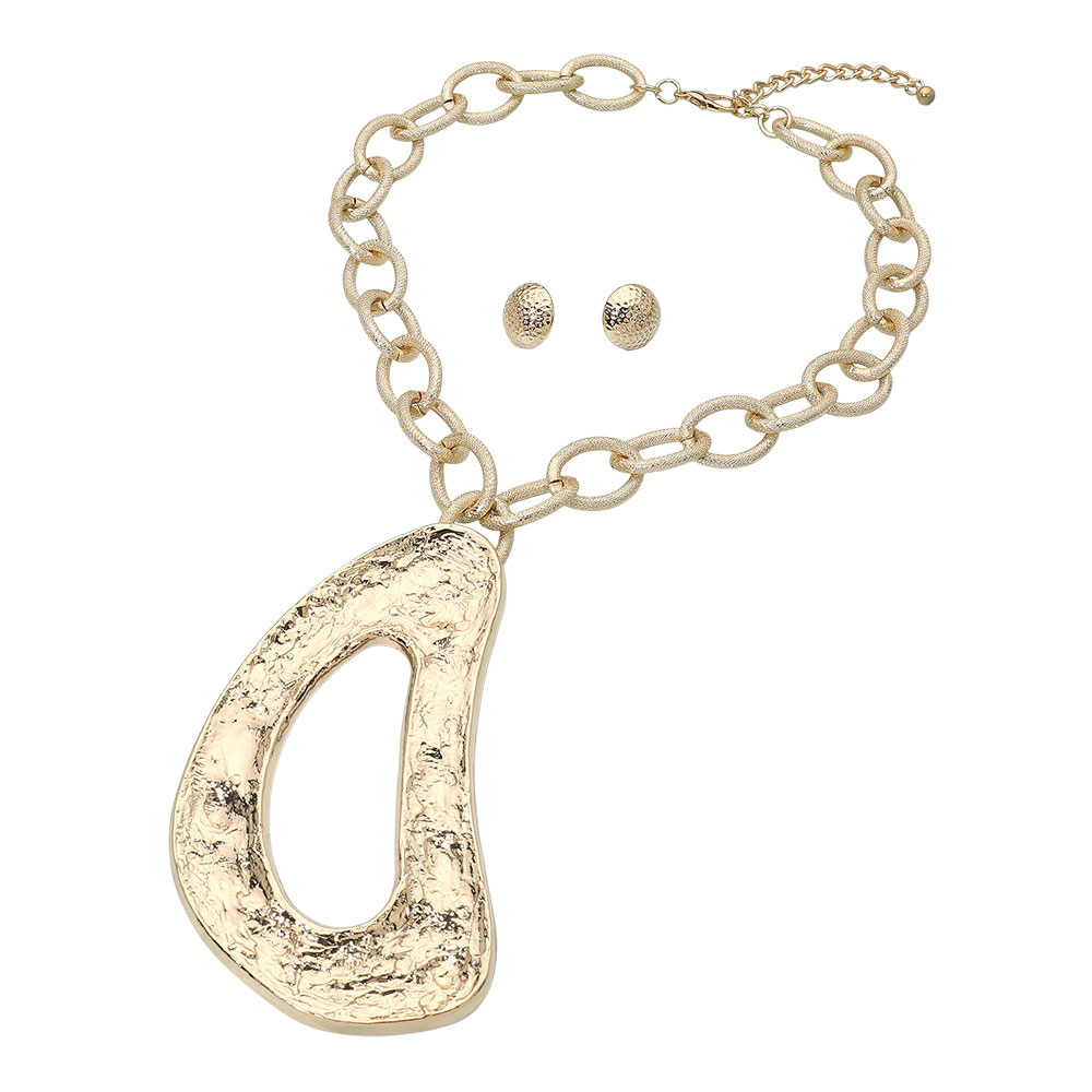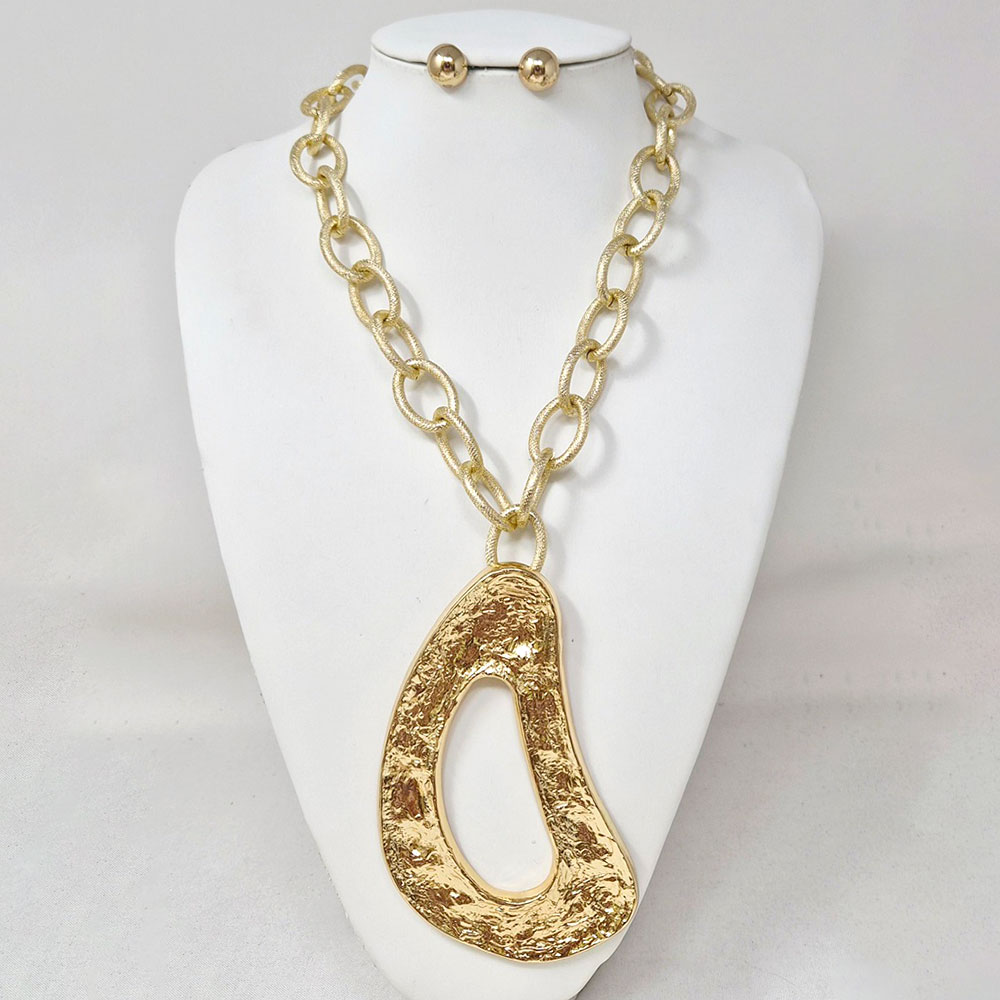 Details • Necklace Size : 21" + 3" L • Pendant Size : 3" X 5" • Earrings Size : 0.7" L • Make a bold style statement with this abstract textured pendant chain necklace. Featuring a sculptural open-design pendant on a chunky link chain, it adds a modern, artistic touch to any outfit—perfect for elevating both minimalist and high-fashion looks. • Lead and Nickel Compliant