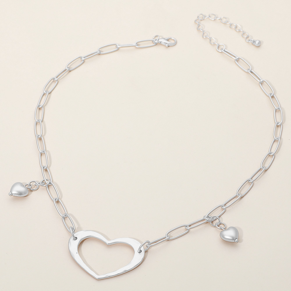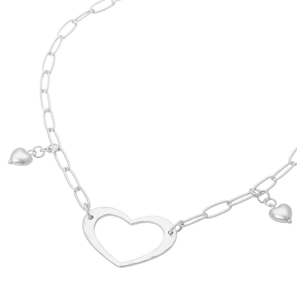 Brushed Metal Open Heart Pendant Bead Charm Paperclip Chain Necklace