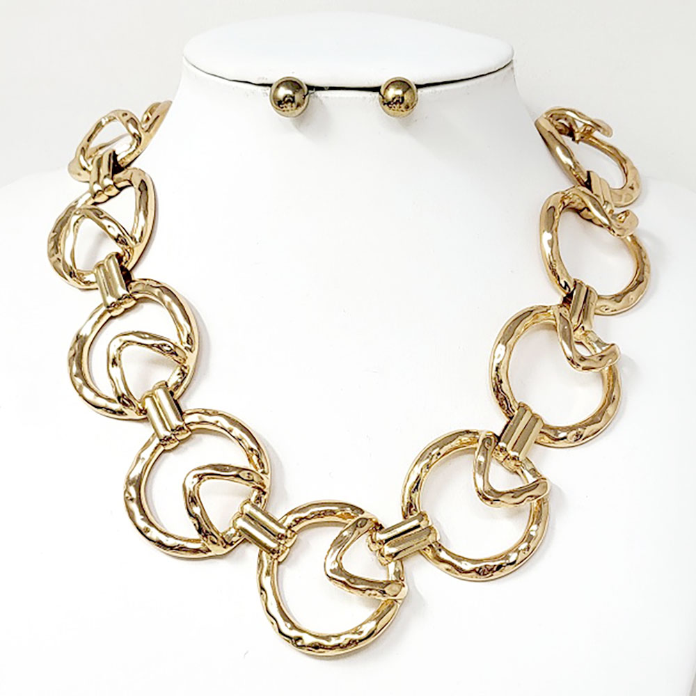 • Bold statement jewelry set featuring a chunky hammered link necklace with matching stud earrings. Designed with interlocking circular links, this striking set adds texture and shine, perfect for elevating both casual and formal looks with confident, modern style.