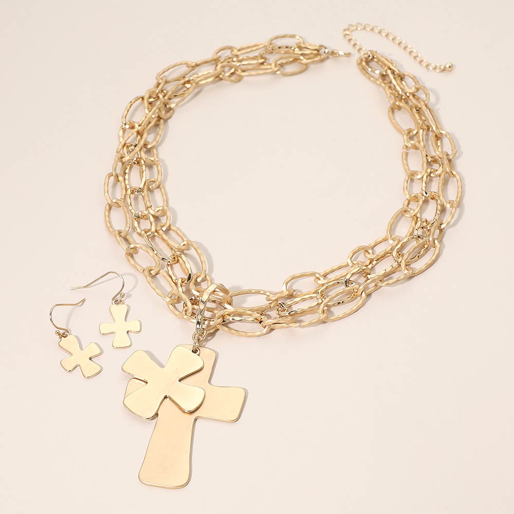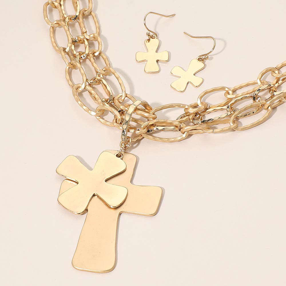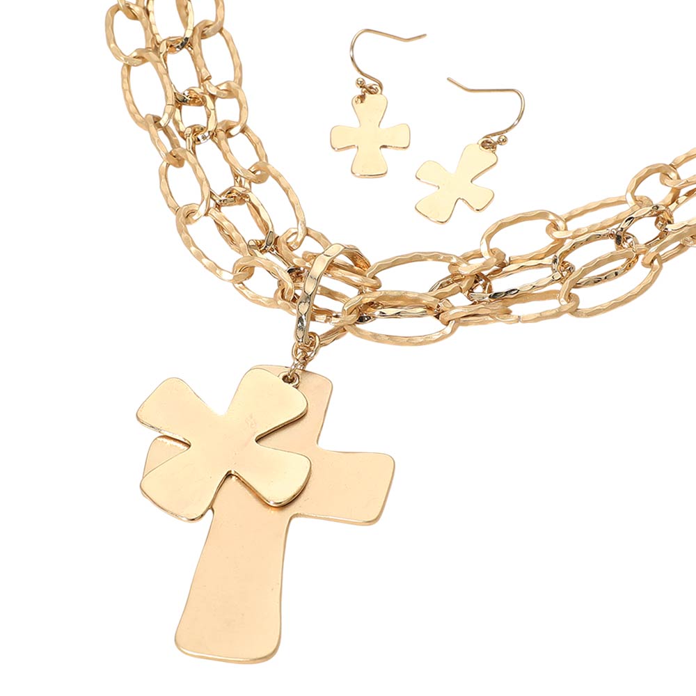 • This layered cross pendant necklace set features a bold cross charm paired with textured multi-link chains and matching drop earrings for a coordinated look. The dimensional design creates visual impact while remaining easy to style for everyday wear or meaningful gifting. A versatile jewelry set ideal for boutiques seeking symbolic pieces that blend modern layering with timeless appeal.