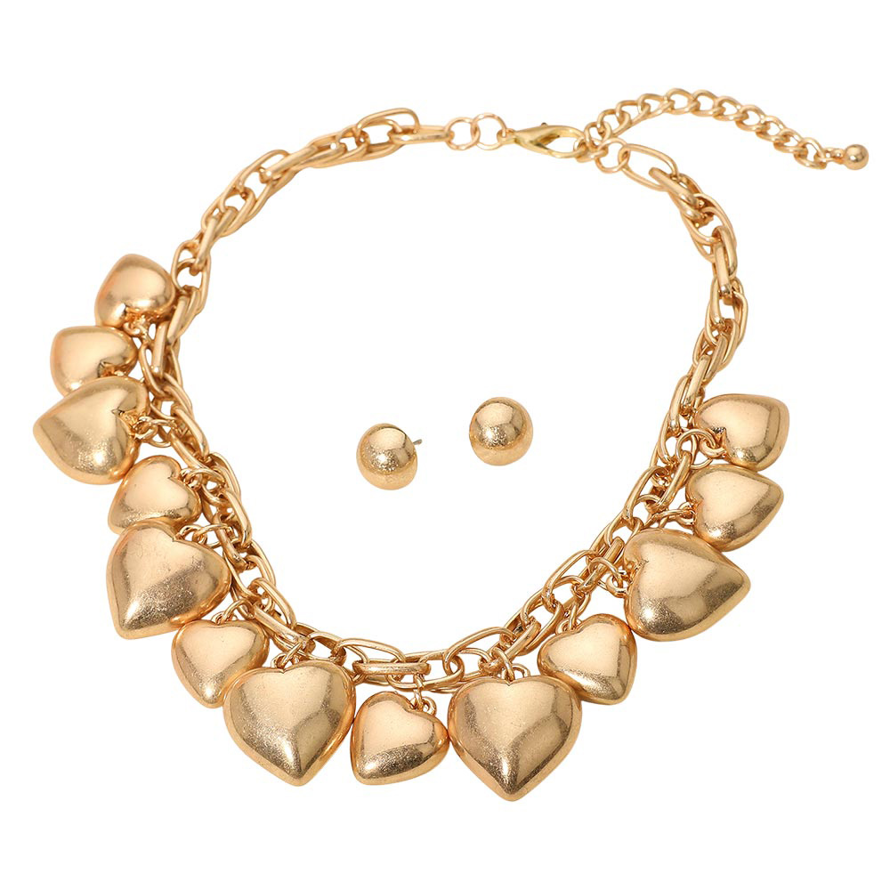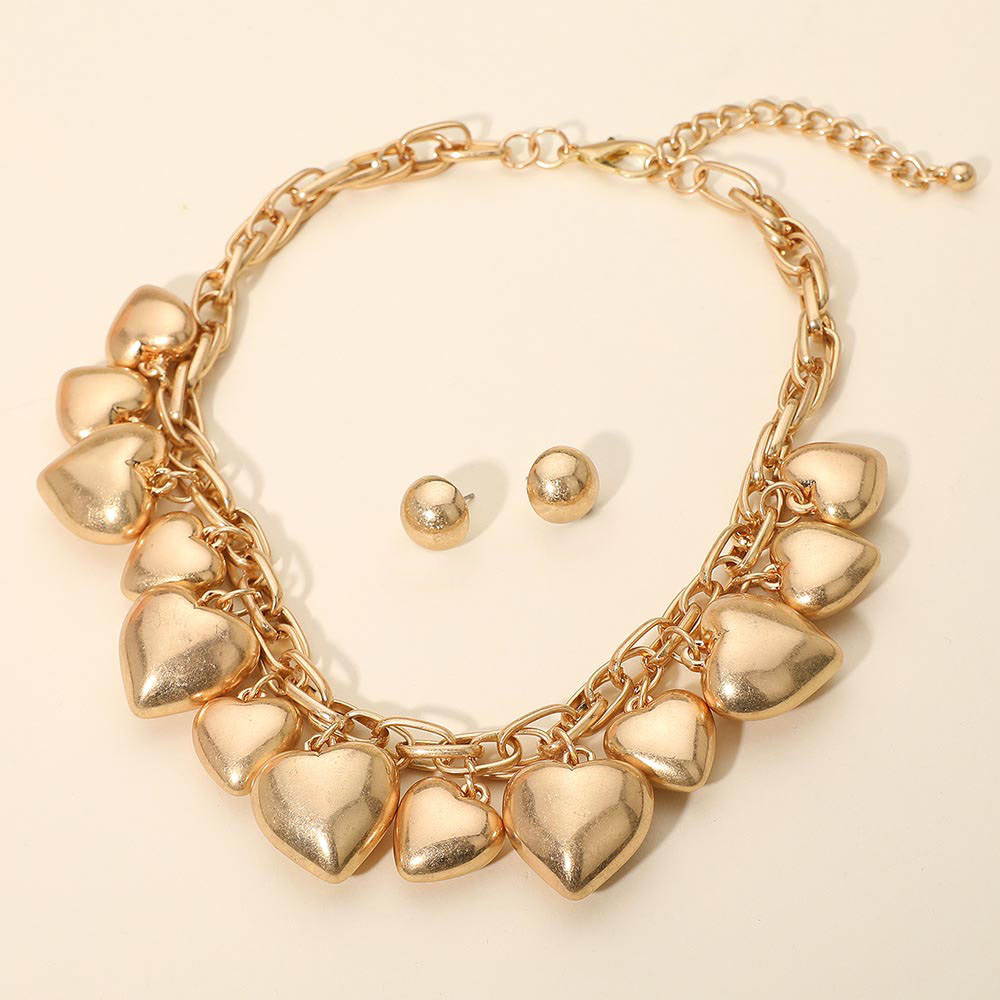 Details • Necklace Size : 16.5" + 3" L • Decor Size : 1.5" L • Earrings Size : 0.5" L • Bold heart charm chain necklace paired with matching stud earrings for a coordinated look. Features layered links and smooth puffed hearts for a statement finish that elevates casual and dressy outfits alike, adding a romantic and confident touch to any jewelry collection. • Lead and Nickel Compliant