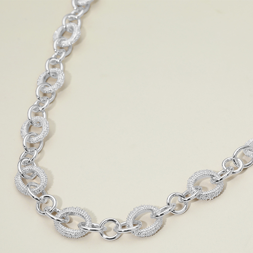 • Elevate your look with this textured link chain necklace featuring alternating smooth and detailed circular links. A bold yet versatile statement piece, perfect for layering or wearing solo. Designed for modern style and timeless appeal, this chain necklace adds sophistication to any outfit.