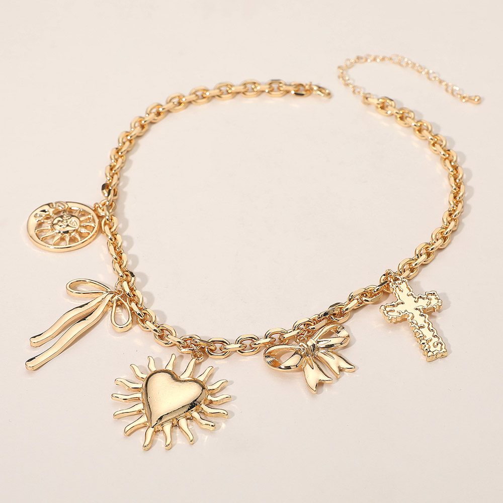 Details • Size : 15" + 3.25" L • Decor Size : 1.75" L • Elevate your look with this elegant charm necklace featuring a radiant heart, delicate bows, and symbolic accents. The detailed gold-tone design adds a chic, feminine touch that transitions seamlessly from day to night, making it a perfect statement accessory or thoughtful gift. • Lead and Nickel Compliant