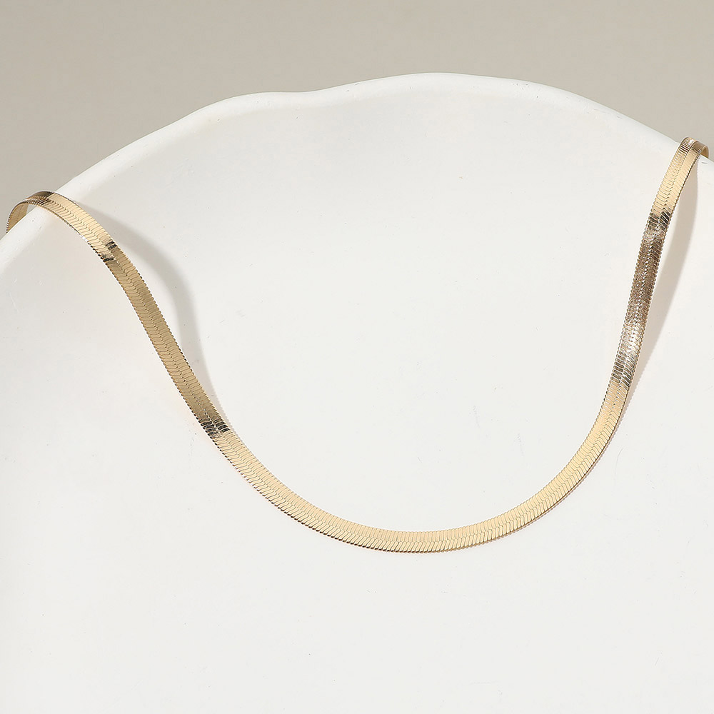 • A sleek flat snake chain necklace designed for effortless elegance. Its smooth, reflective finish lays beautifully against the neckline, creating a refined statement whether worn alone or layered. Perfect for adding a polished touch to everyday outfits or enhancing evening looks with subtle sophistication.