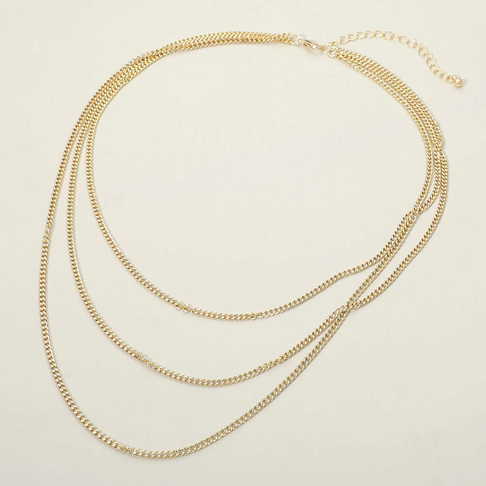 Details • Necklace Size : 18" + 3.25" L • Decor Size : 3" L • This triple layer link chain necklace delivers a bold yet refined layered look designed for easy styling. Its balanced drape creates dimension without effort, making it ideal for everyday wear or statement layering. A versatile essential for boutiques and wholesale collections seeking modern, trend-driven jewelry with lasting appeal. • Lead and Nickel Compliant • Gold Dipped