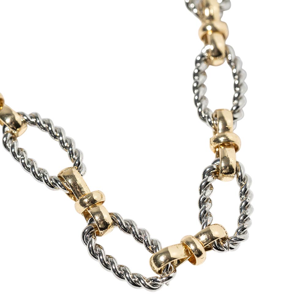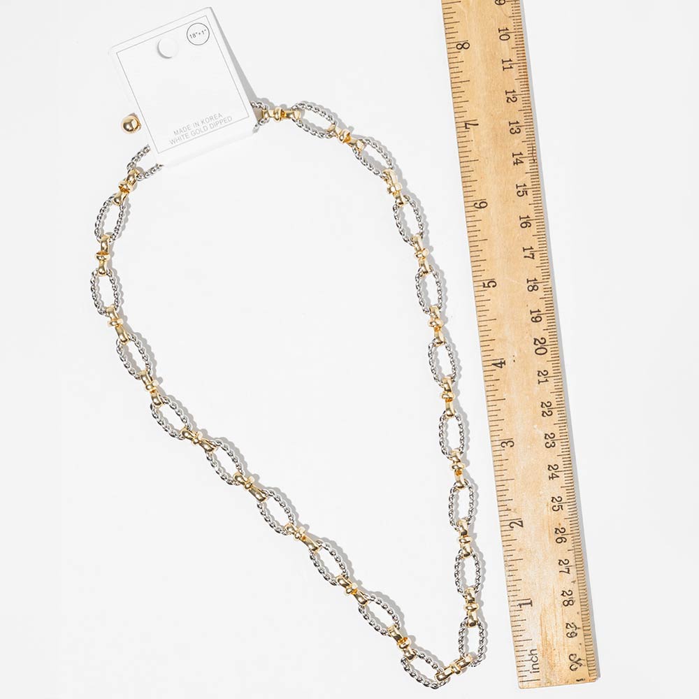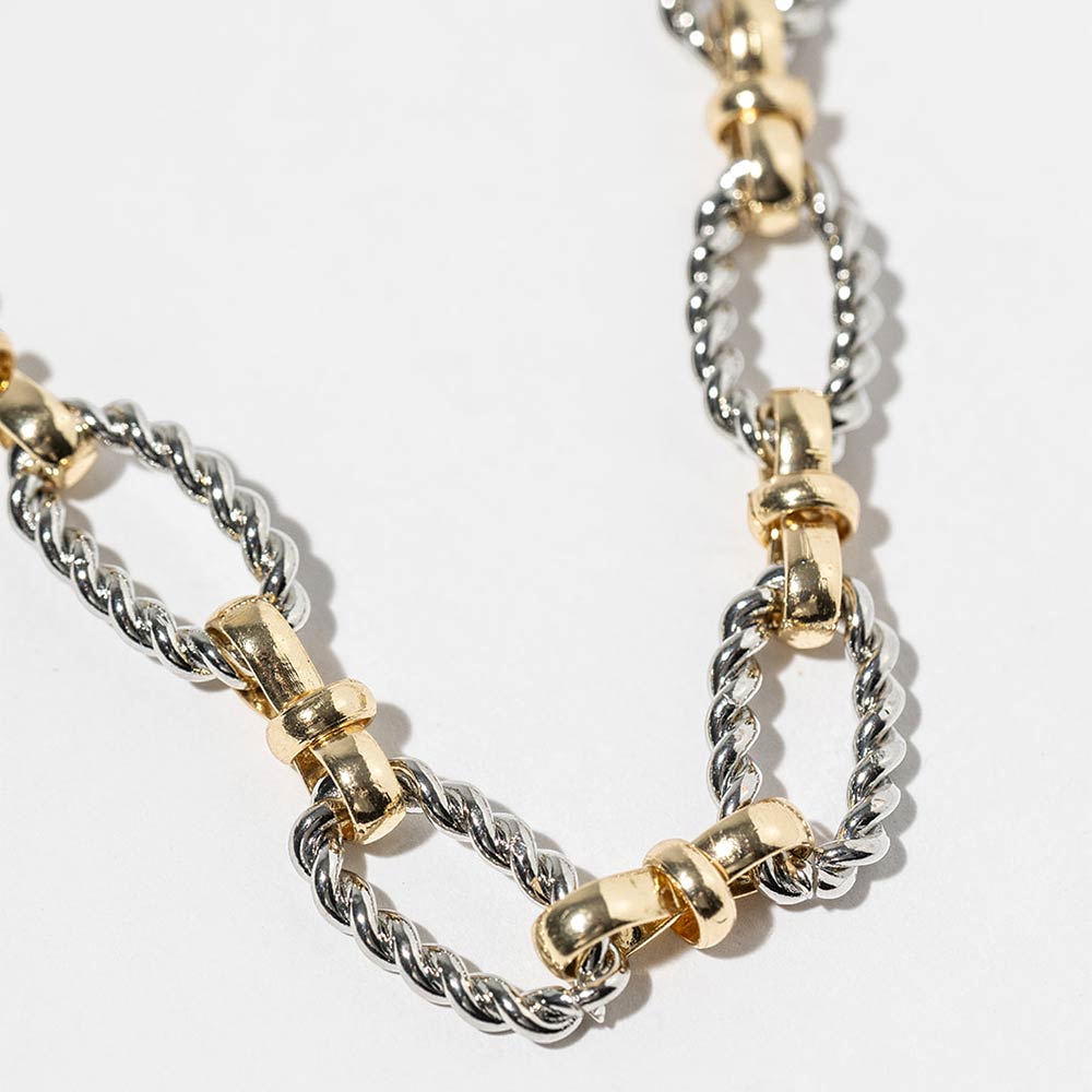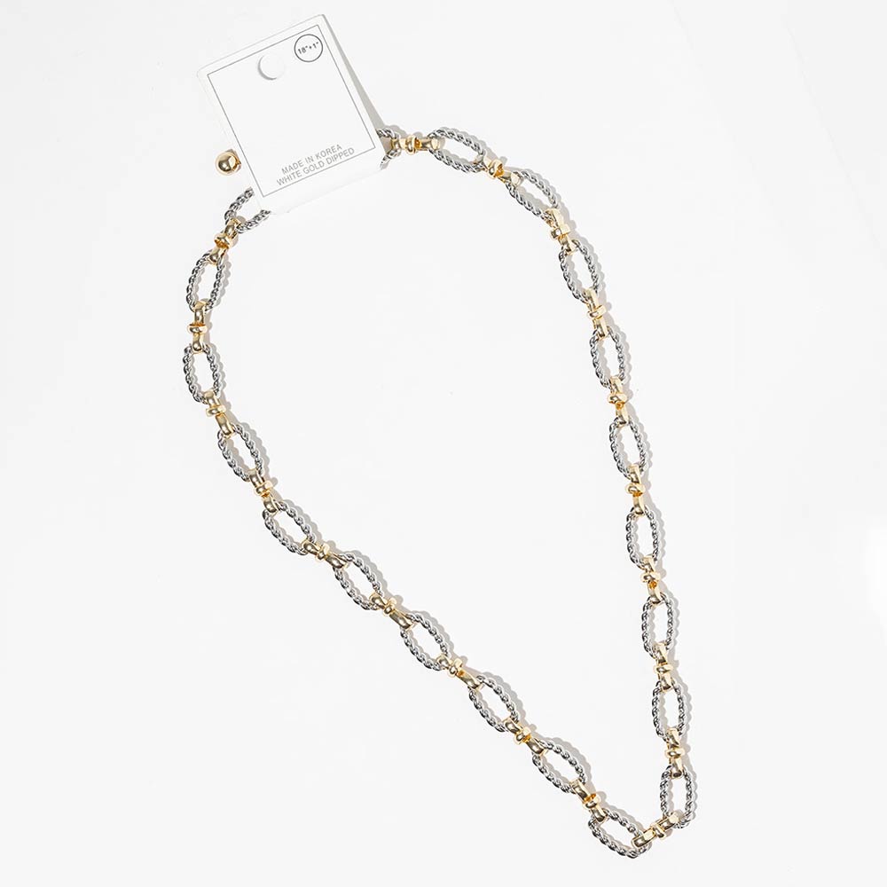 Details • Necklace Size : 18" + 1" L • Decor Size : 0.3" L • This twisted link chain necklace features interlocking oval links with subtle texture for a dimensional, modern look. Designed to elevate everyday outfits, it layers easily with pendants or stands out on its own, making it a versatile choice for trend-focused collections, gifting, and year-round styling. • Gold Dipped • Lead and Nickel Compliant • Made In Korea