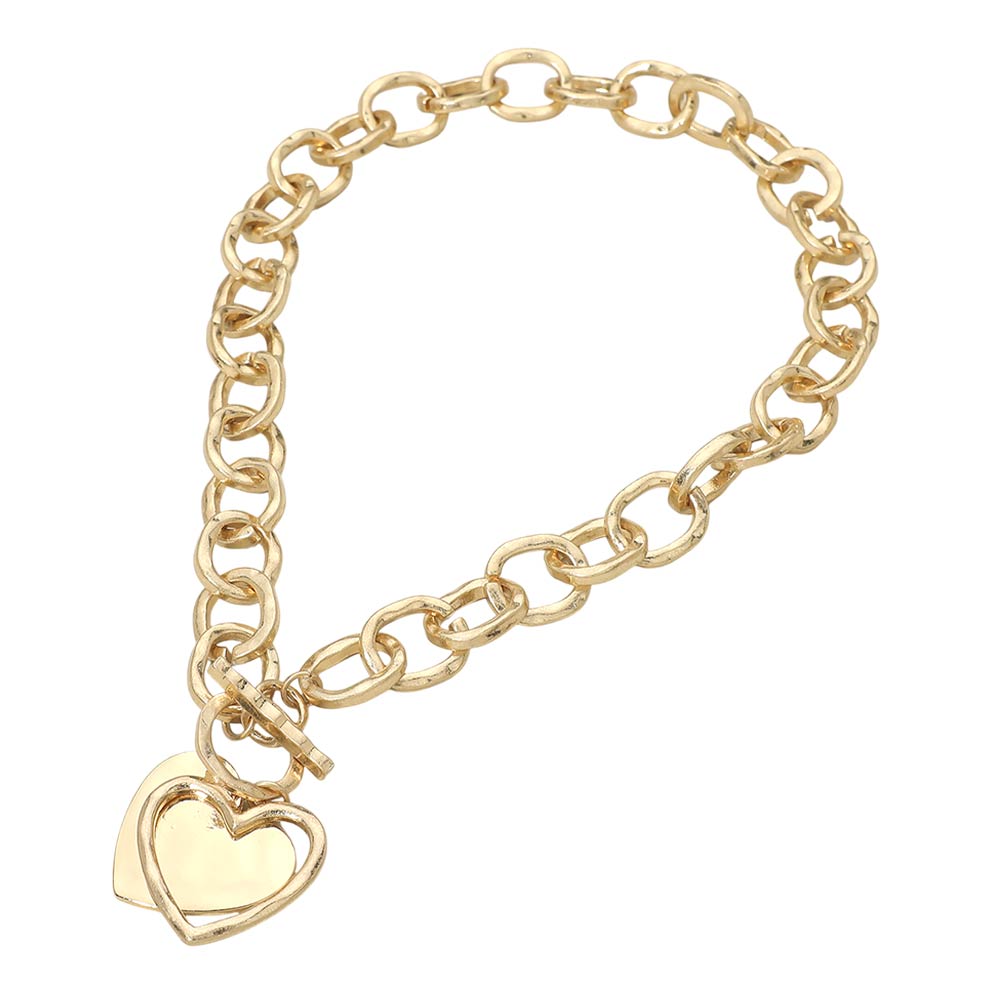 Hammered Layered Heart Charm Chunky Chain Toggle Bracelet