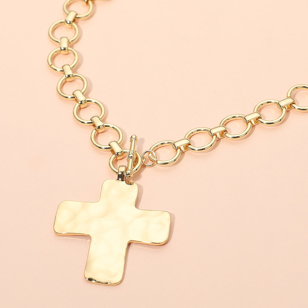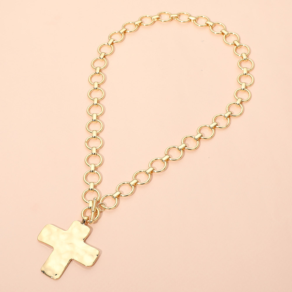 Hammered Matte Metal Cross Pendant Chunky Chain Toggle Necklace