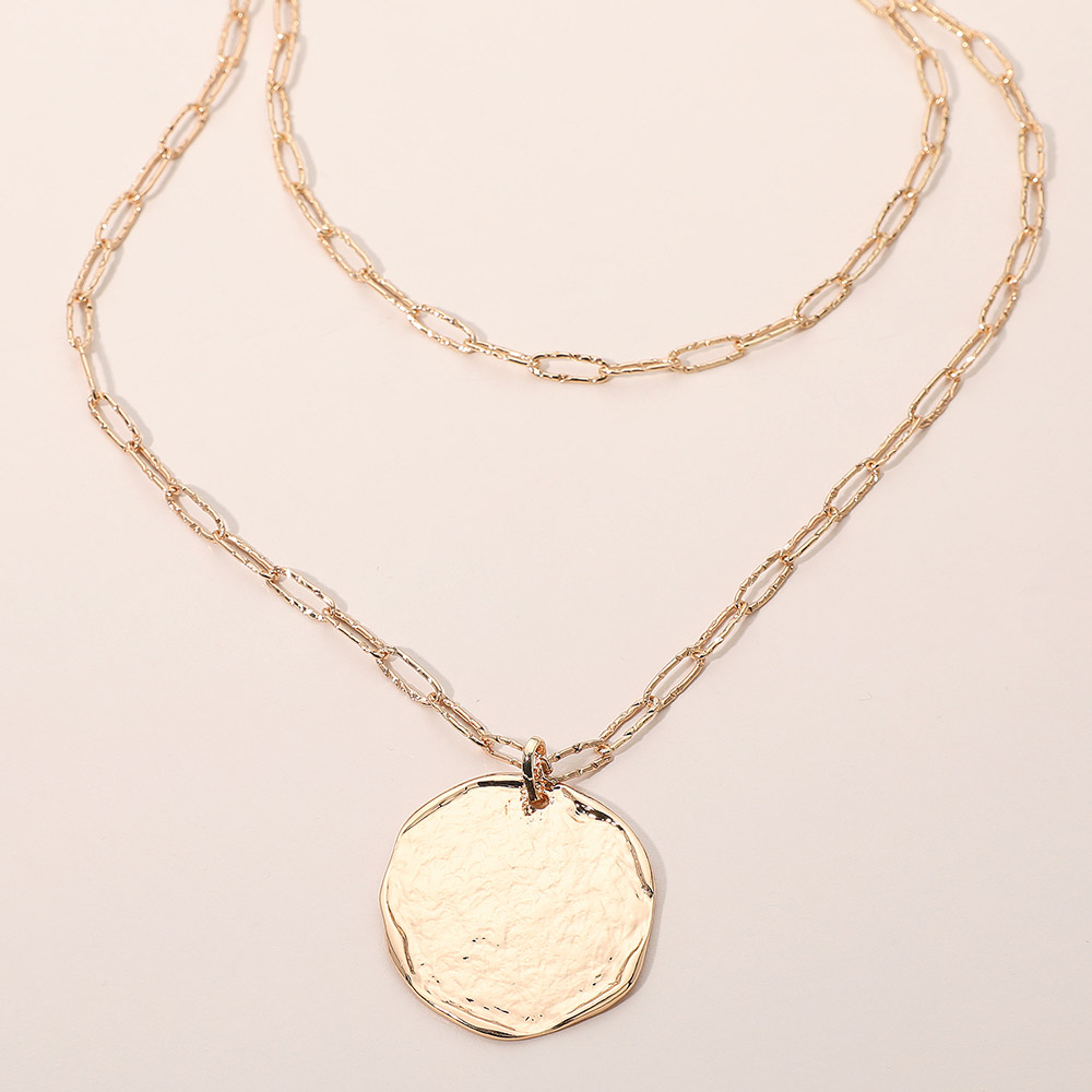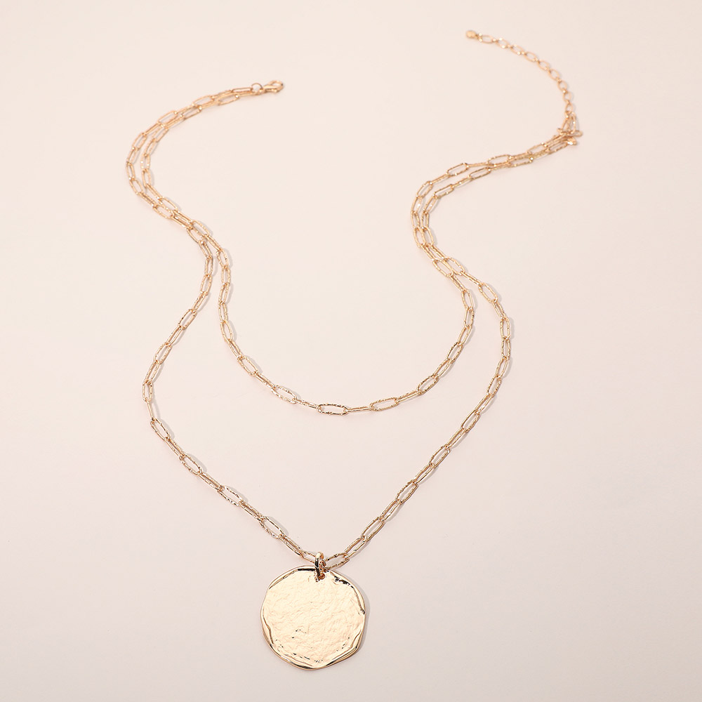 Details • Necklace Size : 20.5" +3" L • Decor Size : 5.5" L • Earrings Size : 1.5" X 1.6" • Stylish layered pendant necklace featuring two delicate link chains with a hammered disc charm. Its elegant yet minimal design adds a modern touch to everyday wear, perfect for layering or as a statement accessory for both casual and dressy looks. • Lead and Nickel Compliant