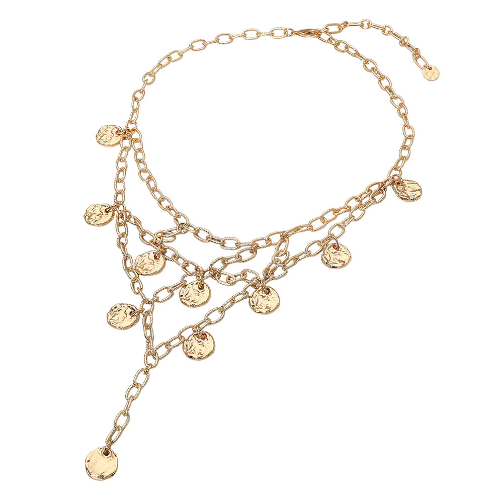 Details • Necklace Size : 16" + 3" L • Decor Size : 5" L • Make a striking impression with this layered disc drop statement necklace featuring cascading chains and shimmering textured accents. Its bold, fluid design adds depth and movement to any ensemble, offering a standout accessory that elevates everyday and evening looks with effortless charm. • Lead and Nickel Compliant