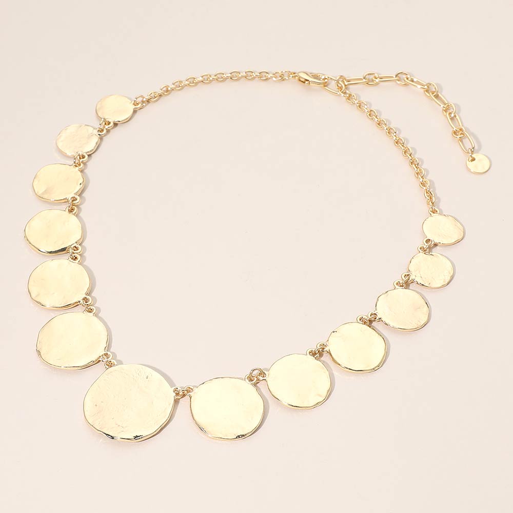 Details • Necklace Size : 16" + 3.5" L • Decor Size : 1" L • This hammered disc chain necklace features a series of linked round discs that create subtle texture and movement. Designed to elevate everyday outfits, it layers easily with other styles or stands out on its own. Ideal for boutiques seeking modern, minimalist jewelry that works for casual wear, work looks, and gift-ready displays with broad customer appeal. • Lead and Nickel Compliant