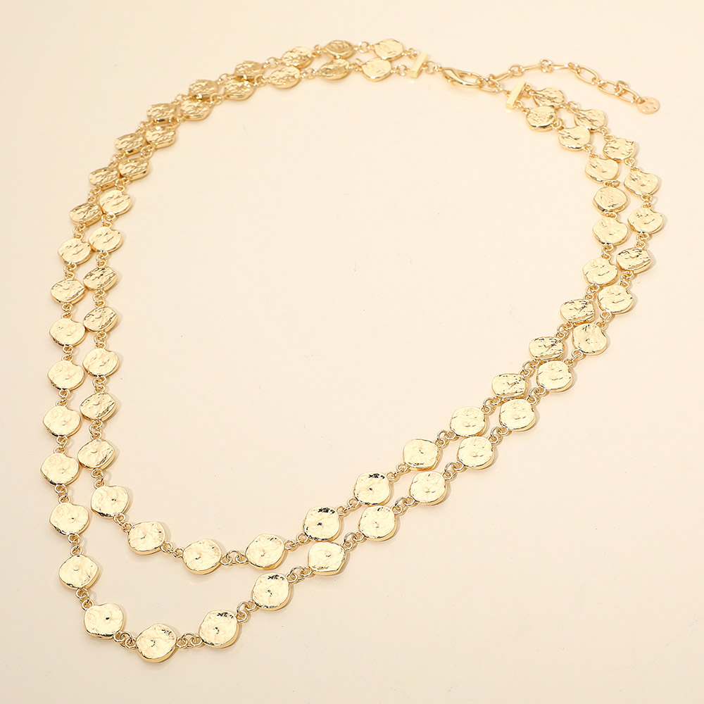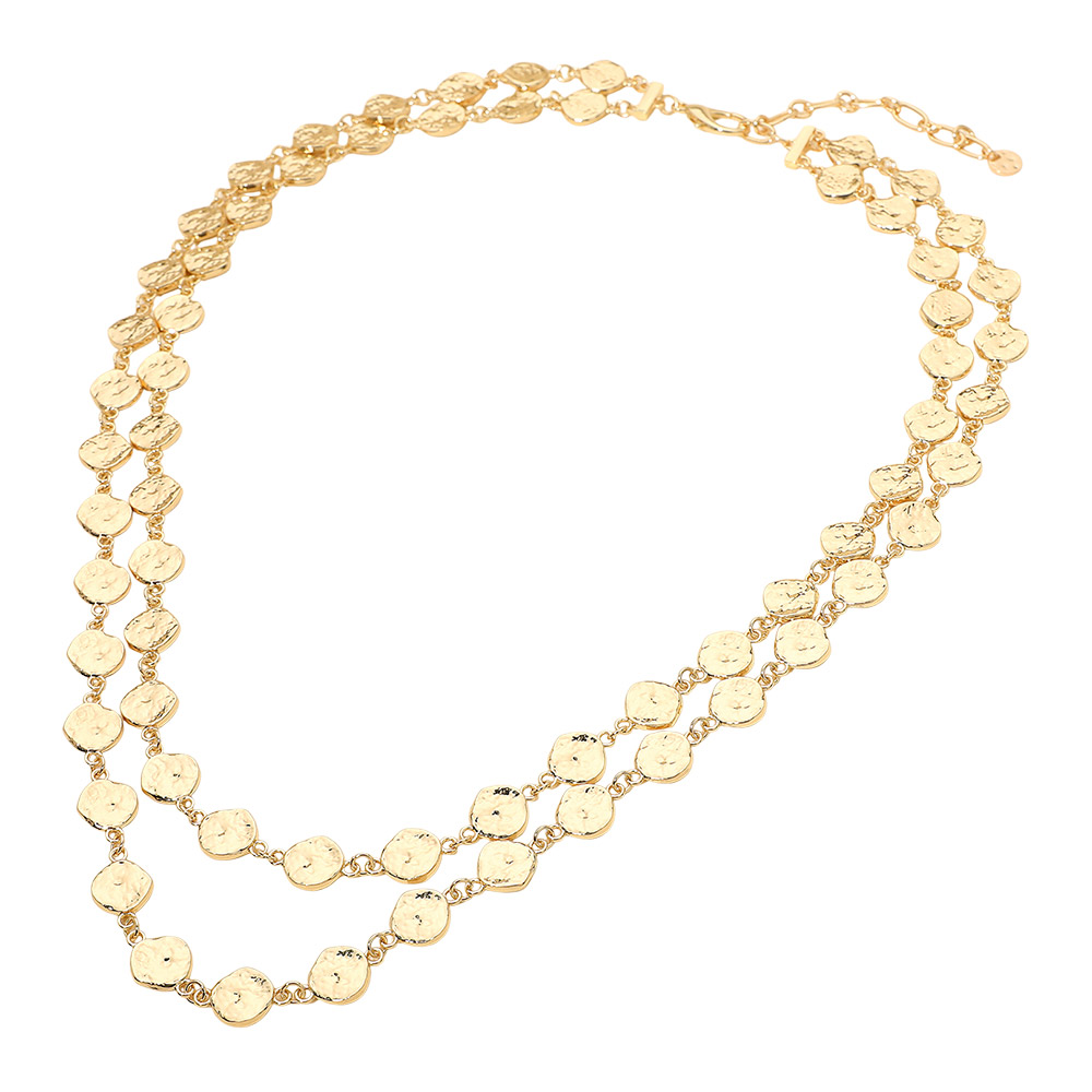 Details • Necklace Size : 25.5" + 3" L • Decor Size : 2" L • A refined layered necklace featuring rows of shimmering coin-style accents that create texture and movement. Its elegant, eye-catching design makes it perfect for enhancing both everyday outfits and elevated looks, offering a versatile accessory with timeless appeal. • Lead and Nickel Compliant