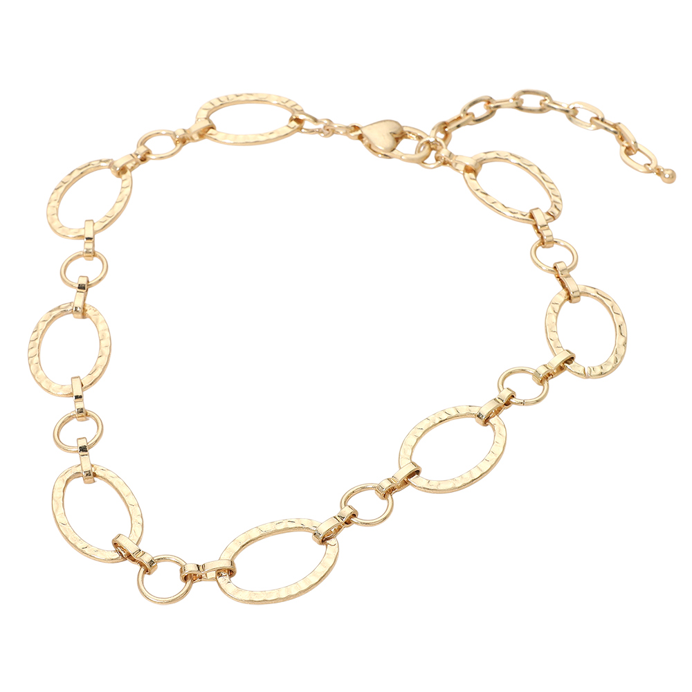 Details • Necklace Size : 17" + 3.25" L • Decor Size : 0.75" L • This hammered oval link chain necklace features elongated links with subtle texture for a refined yet modern look. Designed to sit comfortably on the wrist, it offers a balanced statement that works alone or stacked with other necklaces. An adjustable extender provides a flexible fit, making it ideal for everyday wear, office styling, or polished casual outfits. • Lead and Nickel Compliant