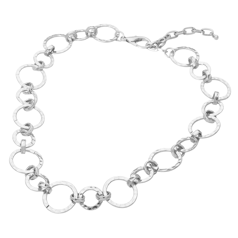 Details • Necklace Size : 18.5" + 3.25" L • Decor Size : 0.9" L • This hammered link statement necklace features bold circular links with an organic, textured finish for a modern yet timeless look. Designed to sit comfortably at the neckline, it adds depth and visual interest without overwhelming an outfit. An adjustable extender allows flexible styling, making it easy to wear alone as a statement or layered with other necklaces for everyday, office, or elevated casual looks. • Lead and Nickel Compliant