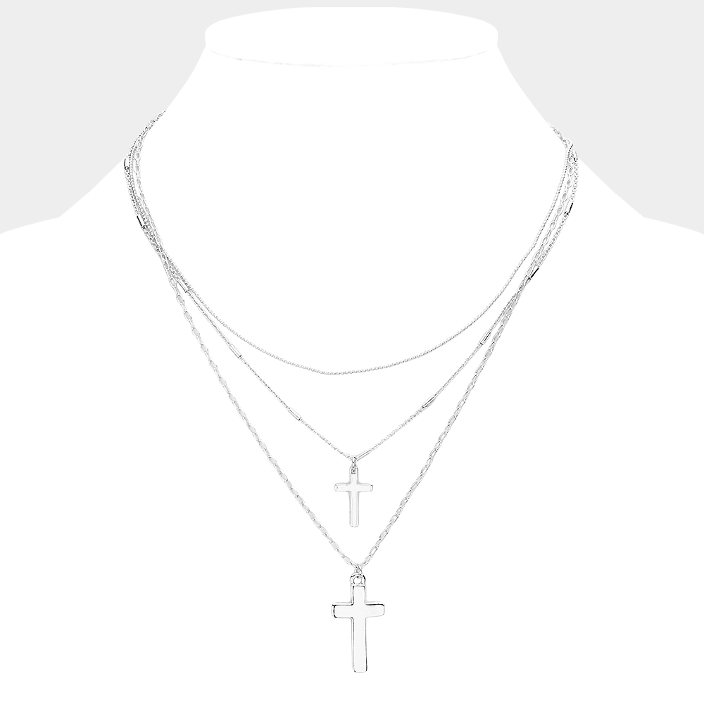Stone Paved Cross Pendant Accent Double Layered Chain Necklace