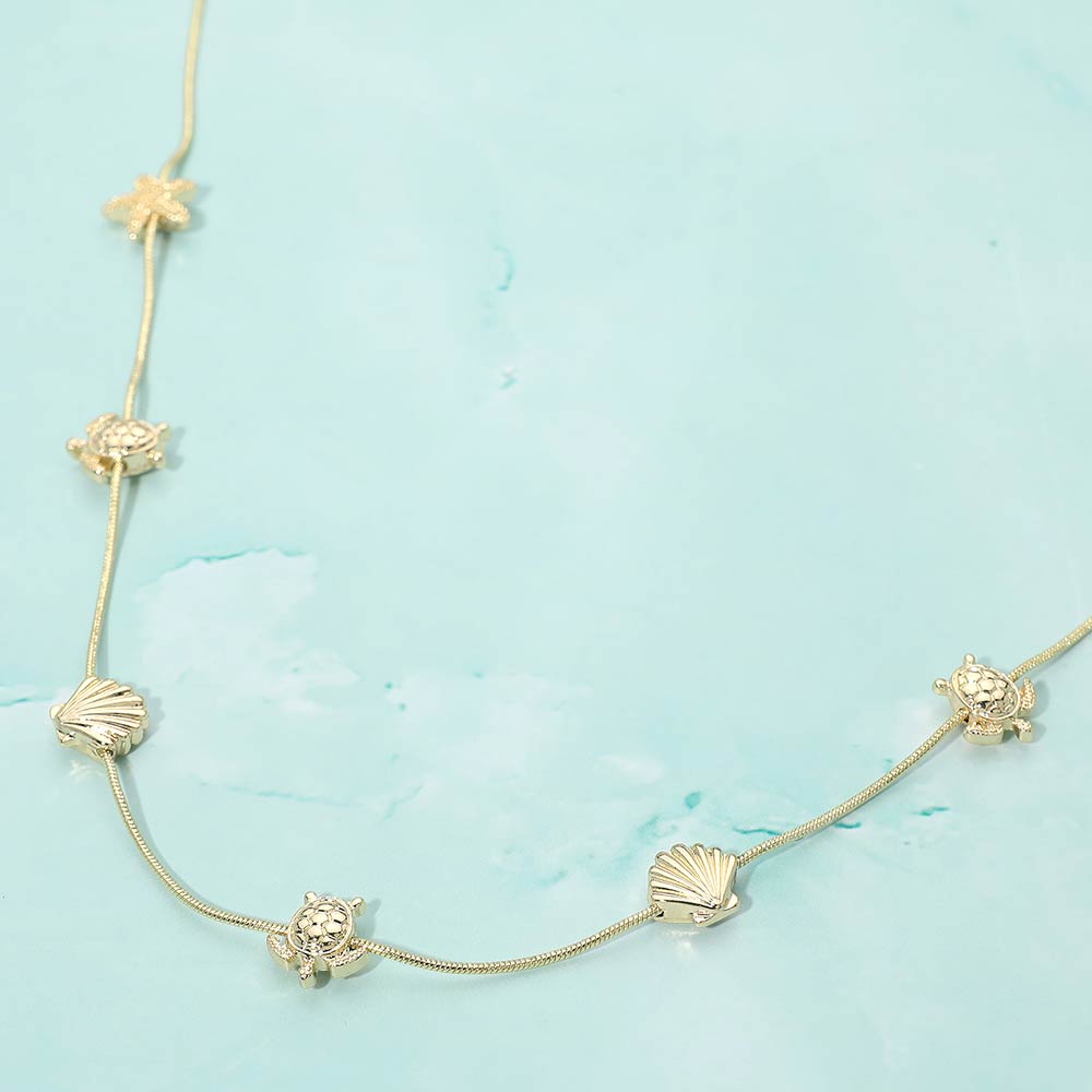• This sea life charm necklace features a slender chain adorned with ocean-inspired icons that add subtle movement and charm. Designed for effortless layering or solo wear, it offers a relaxed yet refined accent ideal for everyday outfits, resort styling, gift shops, and coastal-themed jewelry collections.