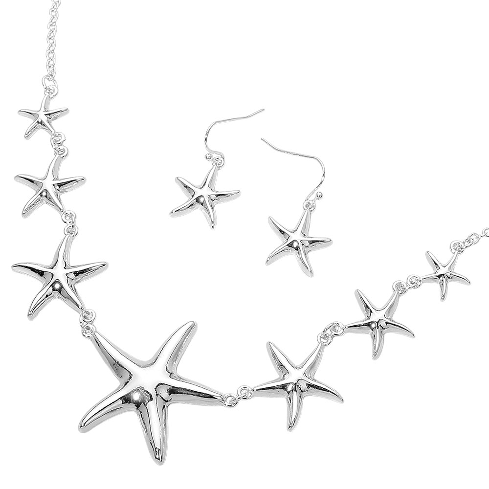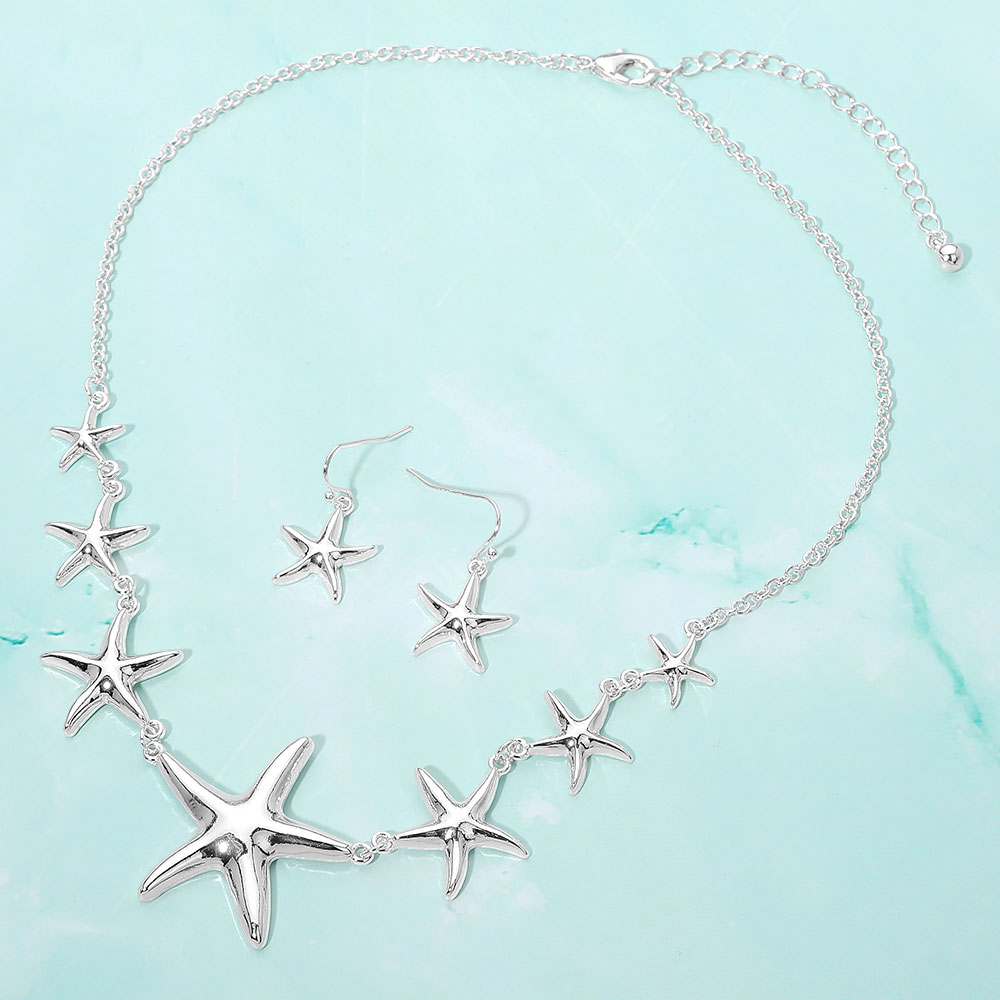Details • Necklace Size : 18" + 3.5" L • Decor Size : 1.4" L • Earrings Size : 1.1" L • Starfish charm necklace and earring set designed to capture a coastal-inspired look with playful charm details. Ideal for summer outfits, beach-themed collections, and gift-ready displays. Easy to style together or separately for everyday wear, vacations, and seasonal retail assortments. • Lead and Nickel Compliant