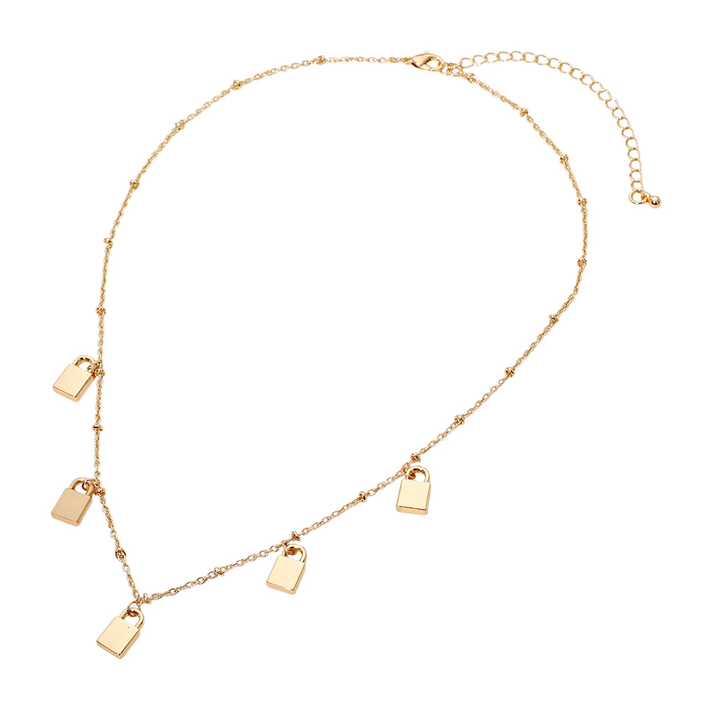 • Trendy mini padlock charm necklace designed with delicate dangling accents for a modern, edgy look. Perfect for layering or wearing solo, this necklace adds subtle statement style to everyday outfits and special occasions, making it a versatile choice for fashion-forward accessory collections.