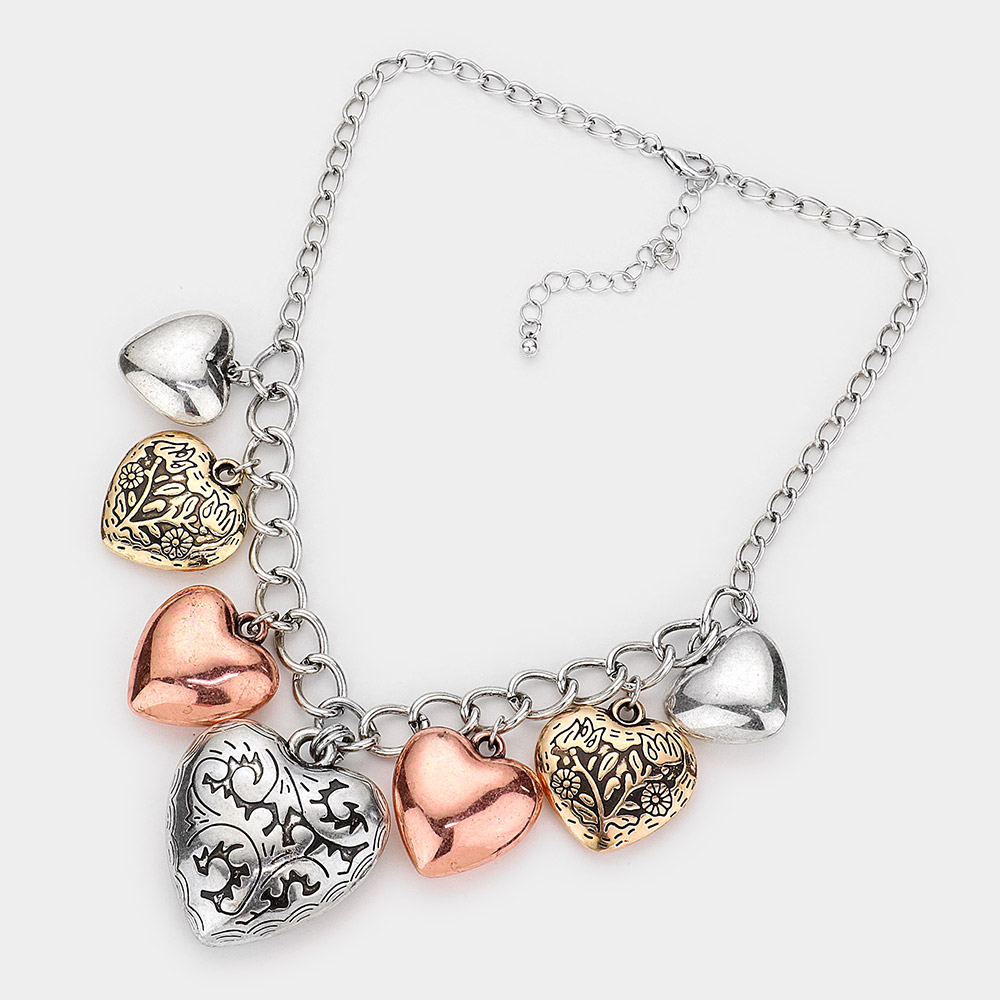 Multi Metal Heart Pendants Dangle Necklace