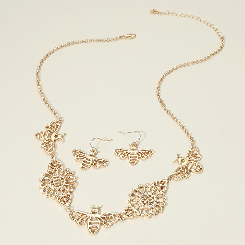• This bumble bee and floral necklace and earring set showcases openwork butterfly accents paired with detailed flower motifs for a graceful, nature-inspired design. Easy to style together or separately, it suits everyday wear, gifting, boutiques, and seasonal collections, offering a delicate statement with versatile appeal.