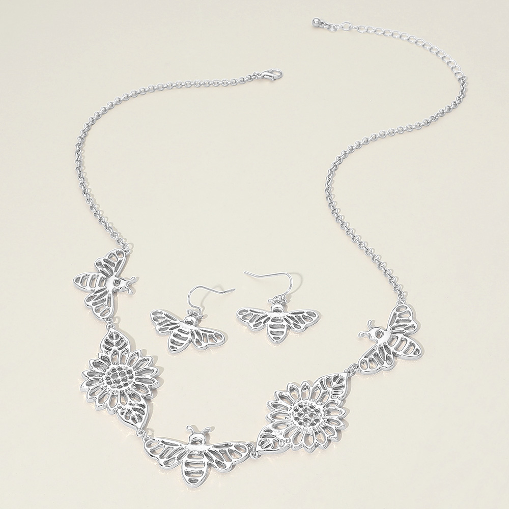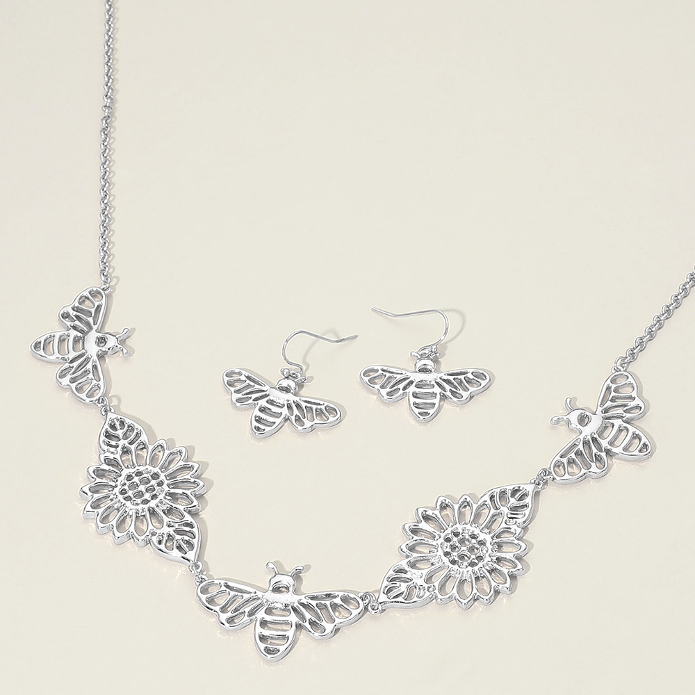 Details • Necklace Size : 22" + 3" L • Decor Size : 1.1" L • Earrings Size : 1.1" L • This bumble bee and floral necklace and earring set showcases openwork butterfly accents paired with detailed flower motifs for a graceful, nature-inspired design. Easy to style together or separately, it suits everyday wear, gifting, boutiques, and seasonal collections, offering a delicate statement with versatile appeal. • Lead and Nickel Compliant