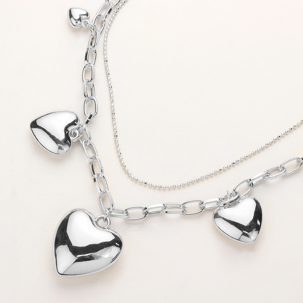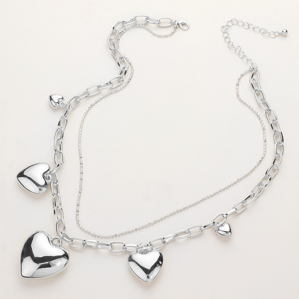 Details • Necklace Size : 16" + 3.5" L • Decor Size : 2.5" L • Charming layered necklace designed with dangling heart accents for a playful yet polished look. Easy to style alone or layered with other pieces, it adds movement and personality to casual and dressy outfits. Ideal for daily wear, gifting, romantic styling, and trend-forward accessory collections. • Lead and Nickel Compliant