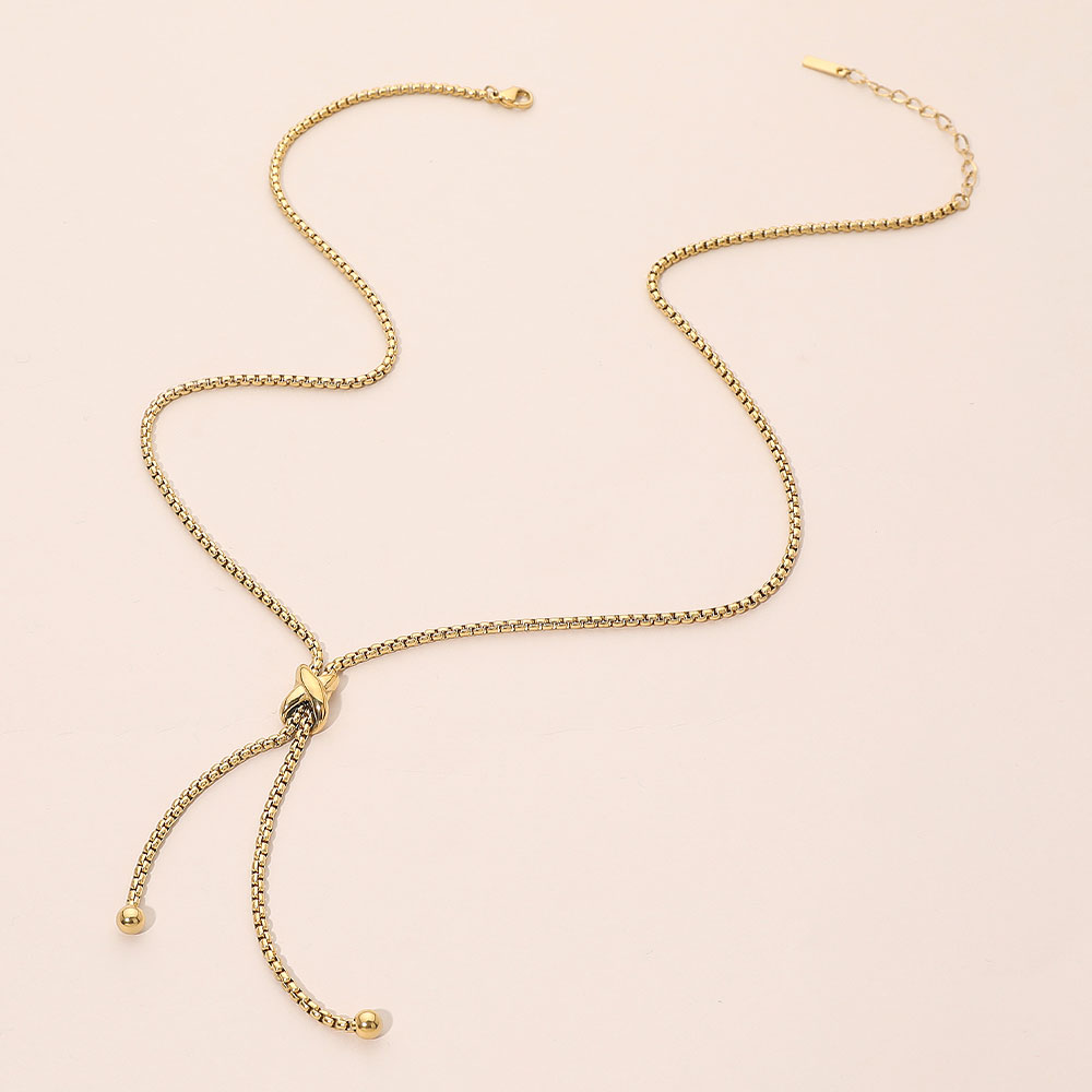 Details • Necklace Size : 20" + 2.5" L • Decor Size : 3" L • Sleek sliding-knot necklace with a fluid Y-style drop that creates a modern, elongated silhouette. Designed for adjustable wear and versatile styling from casual looks to evening outfits, perfect as a solo statement or layered for added dimension. • Hypoallergenic • Stainless Steel