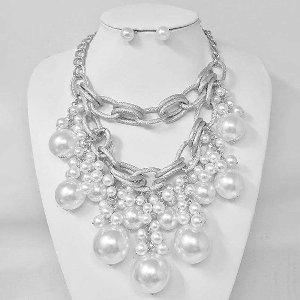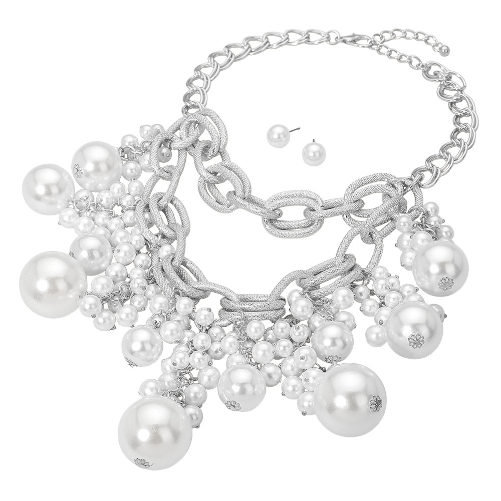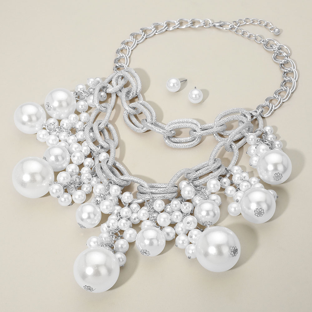Details • Necklace Size : 17.5" + 3" L • Decor Size : 5.5" L • Earrings Size : 0.4" L • Make a glamorous impression with this Chunky Chain Pearl Necklace and Earring Set featuring cascading pearls and a bold link design. Perfect for formal events or upscale evenings, this statement piece combines modern luxury with timeless sophistication for a stunning finish. • Lead and Nickel Compliant