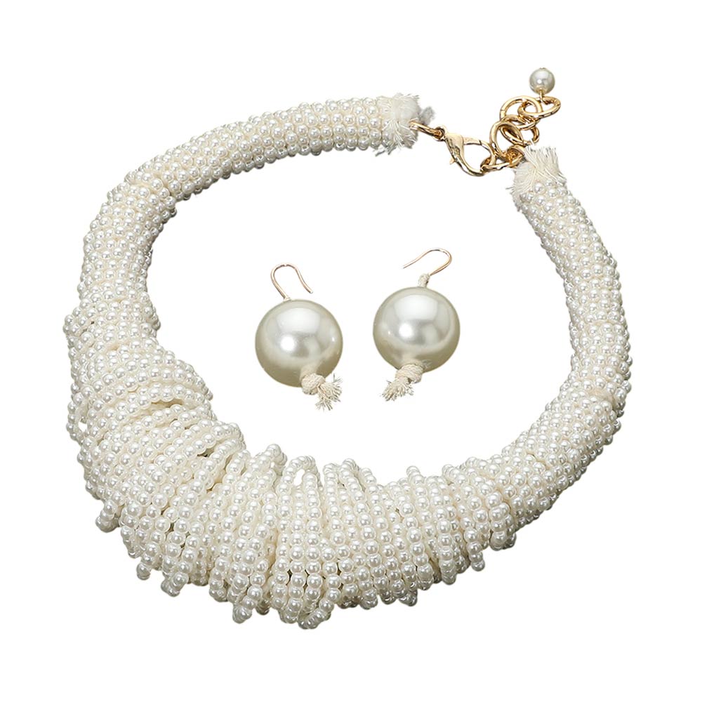 • Striking statement necklace set designed with layered wrapped pearl detailing for dramatic texture and movement. Sits comfortably at the neckline and includes matching drop earrings for a cohesive look. Ideal for special occasions, evening wear, or boutiques seeking bold, fashion-forward pearl jewelry sets.