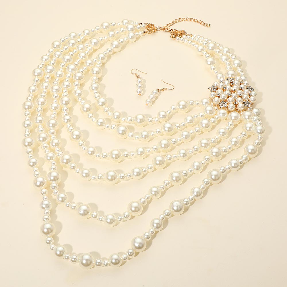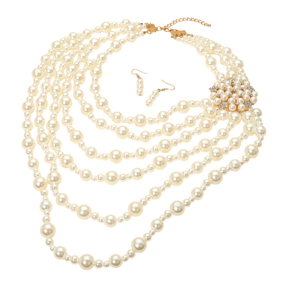 Details • Necklace Size : 18" + 3" L • Decor Size : 8" L • Earrings Size : 1.75" L • Make a glamorous statement with this layered pearl necklace set featuring multiple strands, a floral cluster accent, and matching drop earrings. Perfect for weddings, formal events, or elegant evening wear. • Lead and Nickel Compliant