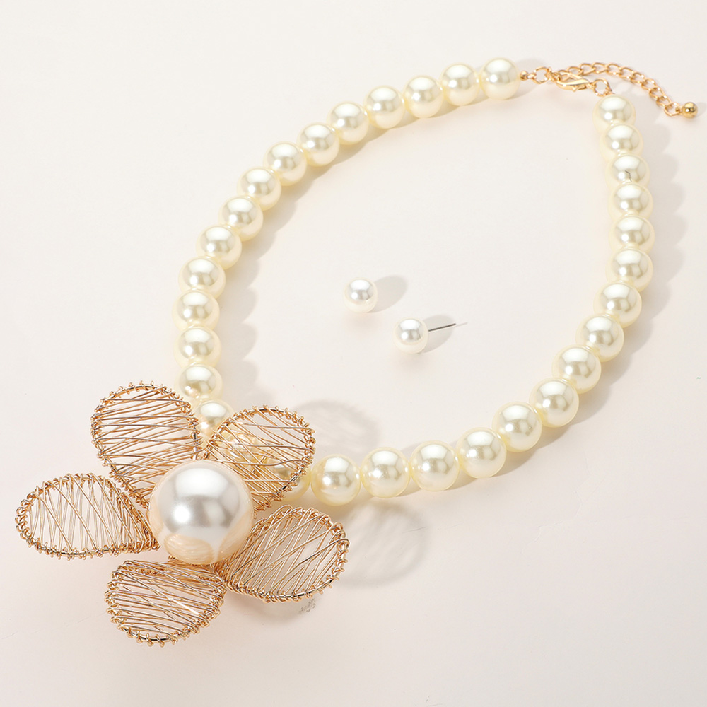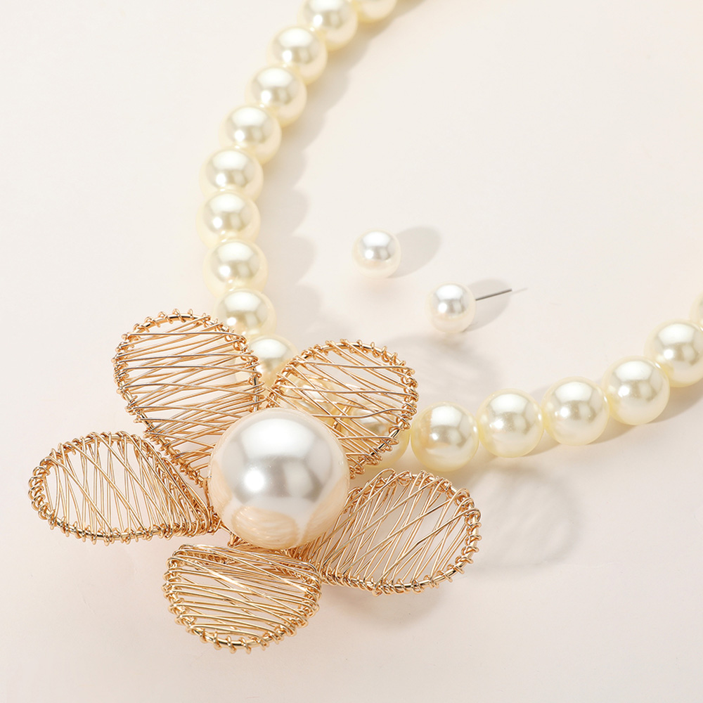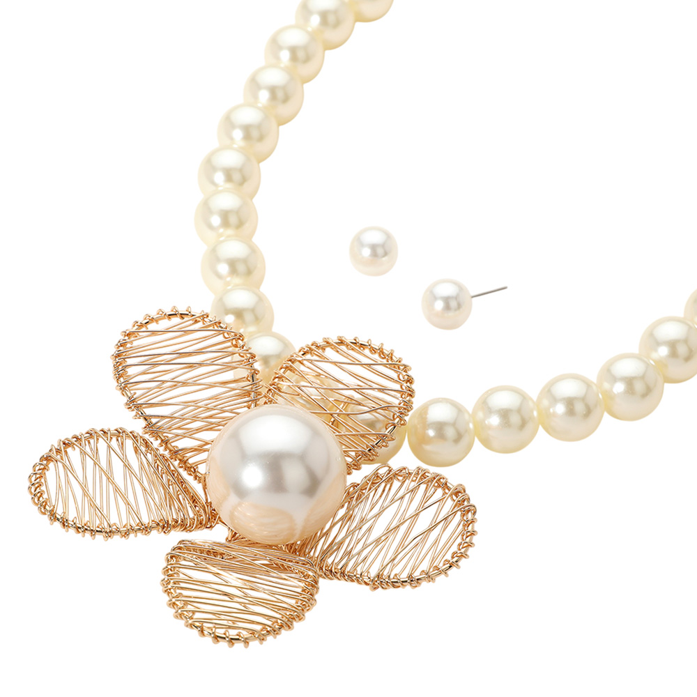Metal Wire Petal Flower Pointed Pearl Statement Necklace