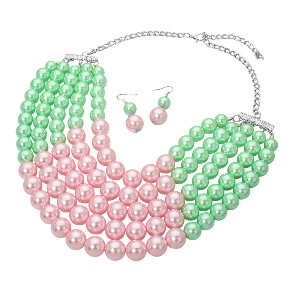Details • Necklace Size : 17.5" + 9" L • Decor Size : 4" L • Earring Size : 2.1" L • This multi-strand bead necklace and earring set delivers a layered statement look with smooth, rounded beads arranged for volume and balance. Designed to elevate dressy outfits, special events, and boutique displays, it offers coordinated styling appeal that works for gifting, formal occasions, and trend-focused accessory collections. • Lead and Nickel Compliant