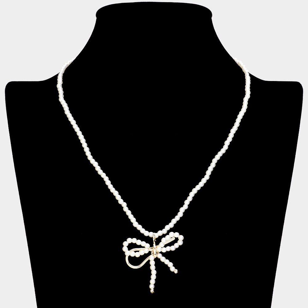 Faceted Beaded Brass Metal Wire Bow Pendant Necklace