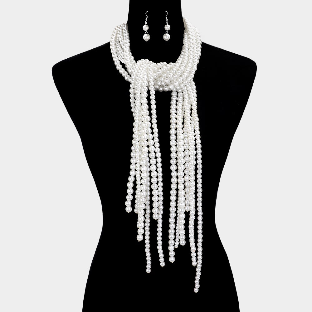 • Elegant multi strand pearl scarf-style necklace designed to drape beautifully with fluid movement and timeless appeal. Features layered strands for a statement look and includes matching drop earrings for coordinated styling. Perfect for formal events, special occasions, or boutiques seeking classic, sophisticated jewelry sets.