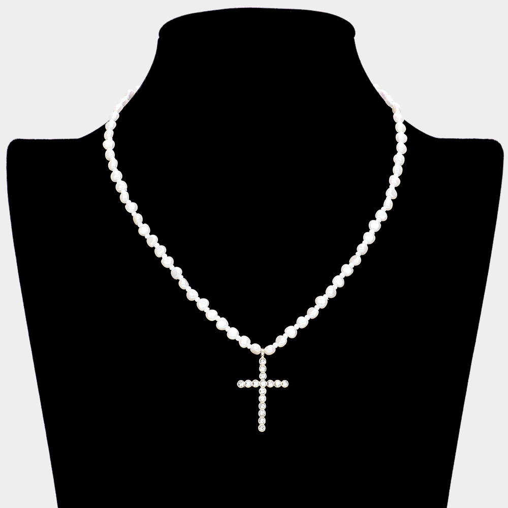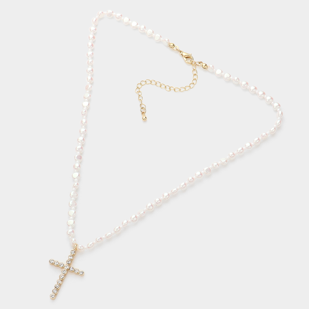 Stone Bezel Cross Pendant Pearl Necklace