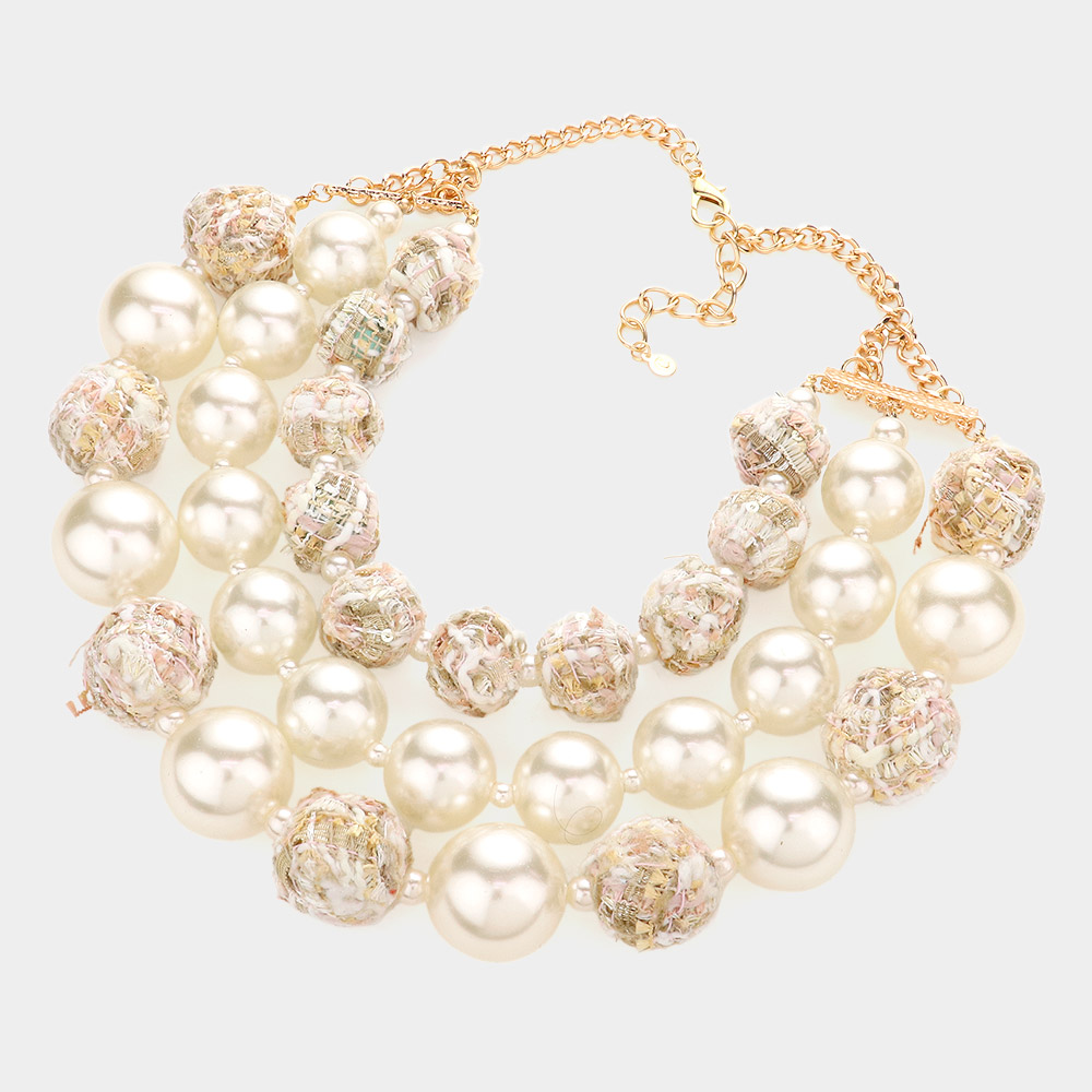 Tweed Fabric Ball Pearl Triple Layered Bib Necklace