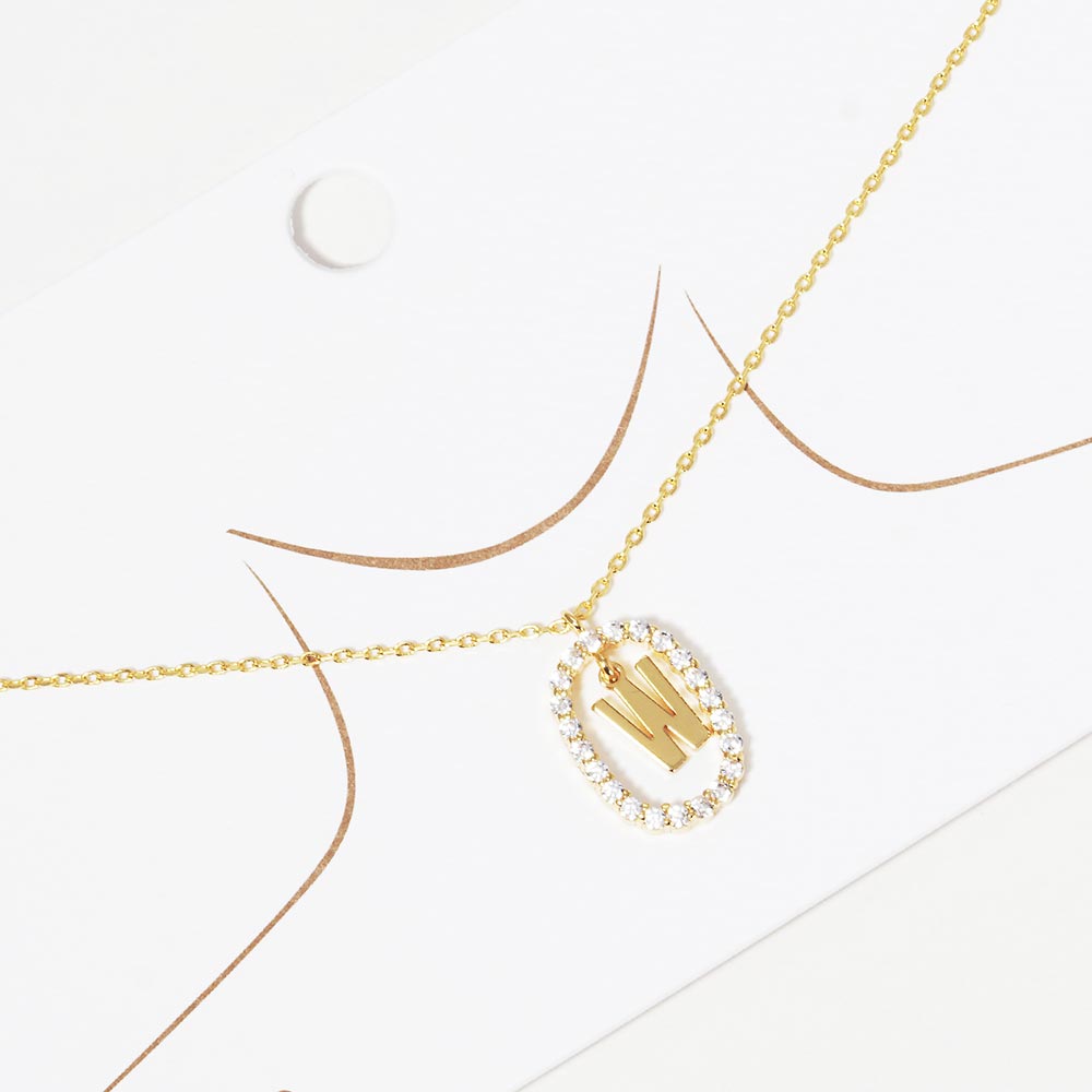 -W- Gold Dipped Metal Initial Monogram Rhinestone Oval Link Pendant Necklace