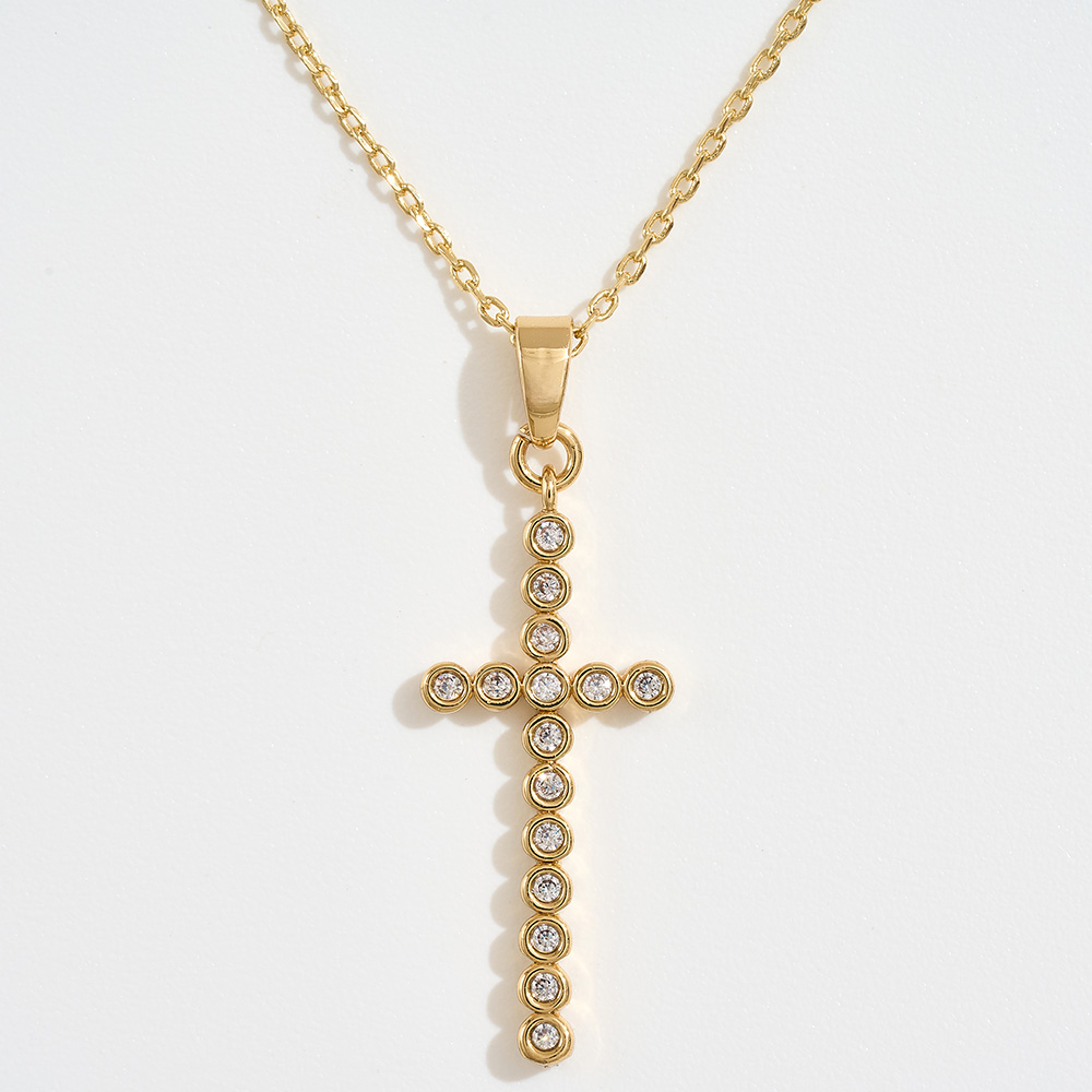 • This cross pendant necklace features a sleek row of bezel-set round stones, creating a refined and radiant design. A modern take on a timeless symbol, it’s perfect for adding elegance to everyday style or gifting as a meaningful keepsake.