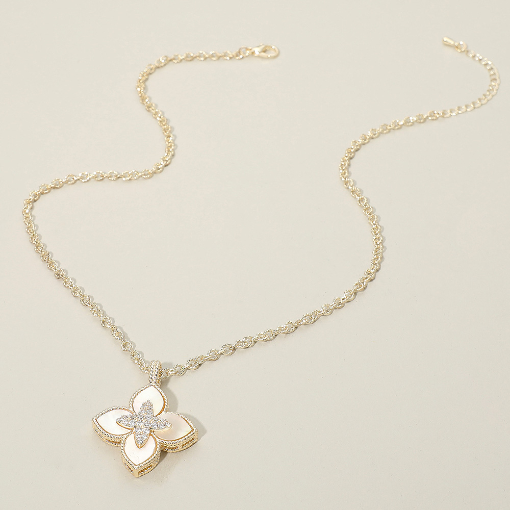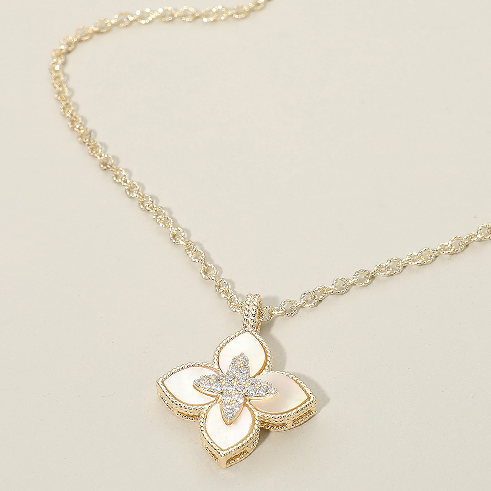 Details • Necklace Size : 17" + 2" L • Pendant Size : 1.25" X 1.5" • This elegant floral pendant necklace features a beautifully detailed petal motif adorned with sparkling crystal accents. Its timeless design and delicate craftsmanship make it perfect for adding a refined touch to both everyday ensembles and special occasions. • Gold Dipped • CZ Cubic Zirconia