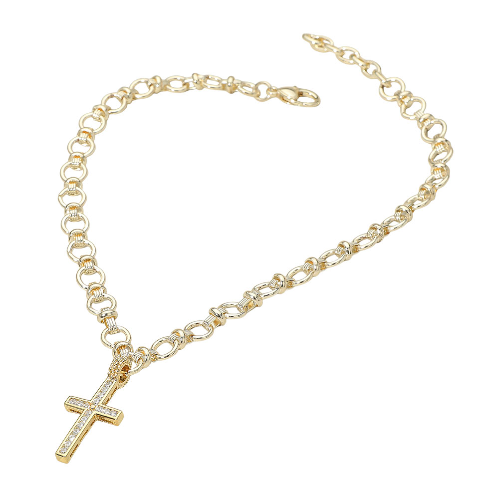 Details • Necklace Size : 18" + 2" L • Pendant Size : 0.8" X 1.7" • Sophisticated chain necklace featuring interlocking circle links and a sparkling cross pendant. A timeless design that blends elegance and symbolism, making it perfect for layering or wearing as a meaningful statement piece. • CZ Cubic Zirconia • Gold Dipped