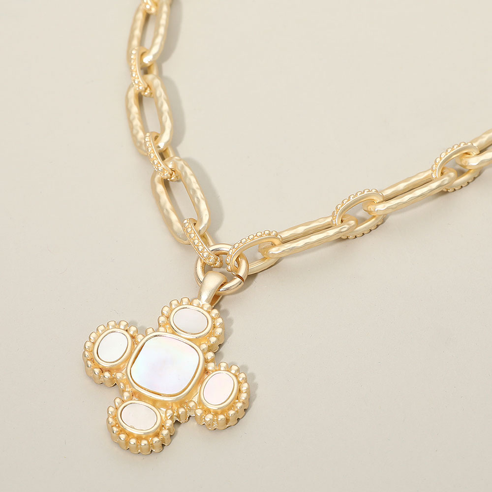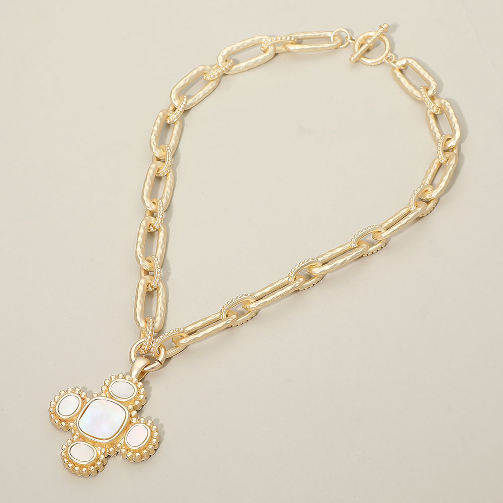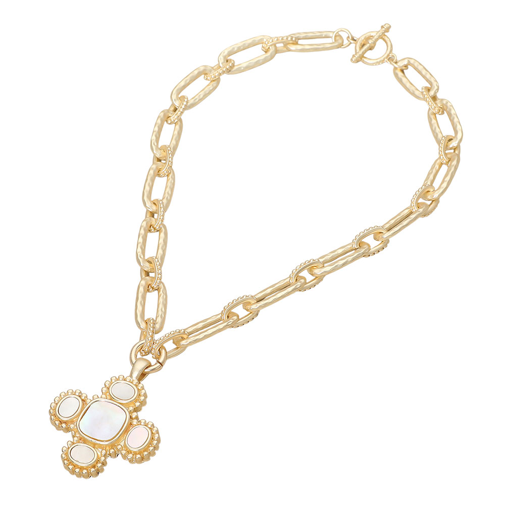 Details • Necklace Size : 17.5" L • Pendant Size : 1.5" X 1.8" • Toggle Closure • Statement link chain necklace featuring a classic quatrefoil charm with smooth and textured detailing for added visual interest. Designed to elevate everyday outfits or layered looks, this timeless piece blends modern structure with elegant charm, making it ideal for boutique and gift-ready jewelry collections. • Gold Dipped