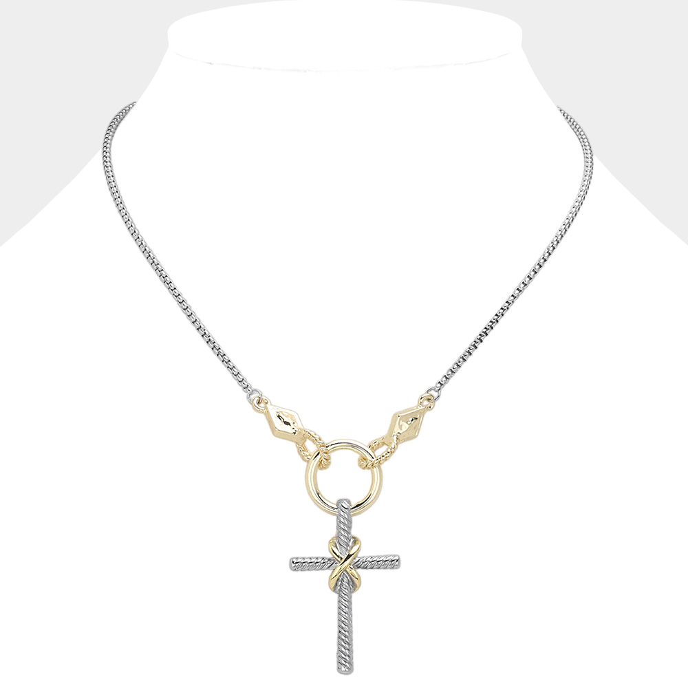 Two Tone Metal Intricate Scroll Cross Stone Cluster Charm Embellished Necklace
